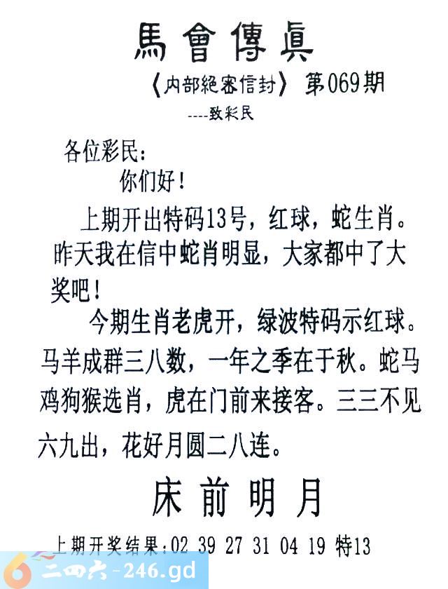 069期:首发推荐:≮馬會傳眞≯→(香港正版)