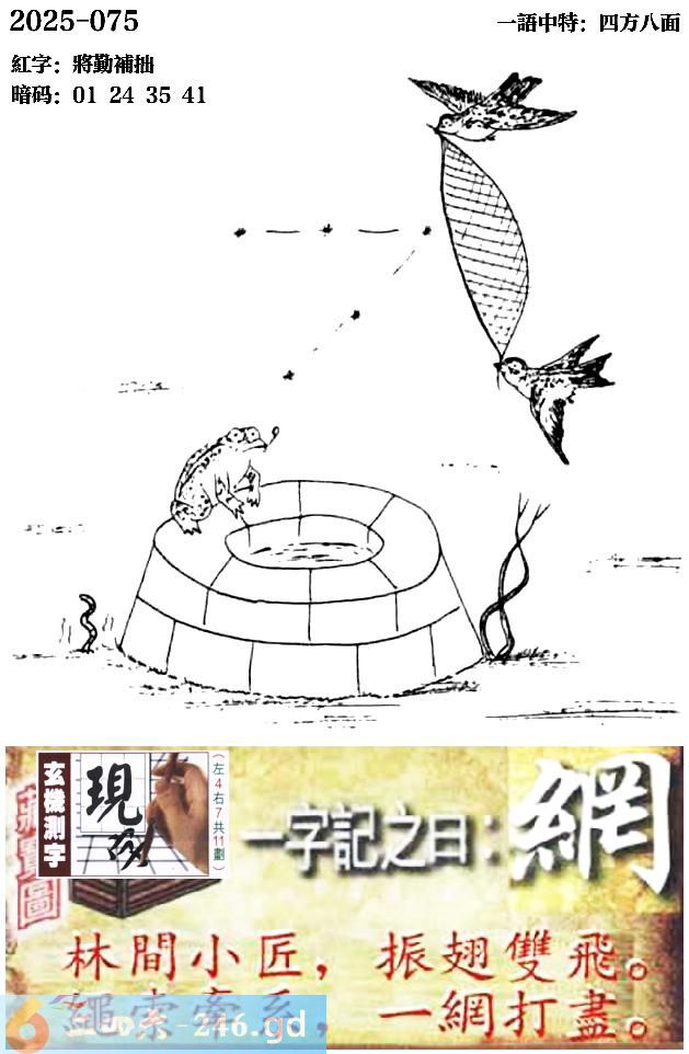 075期跑狗一字記之曰:【網】 林間小匠,振翅雙飛。 繩索牽系,壹網打盡。 玄機測字:《現》 一語中特:四方八面