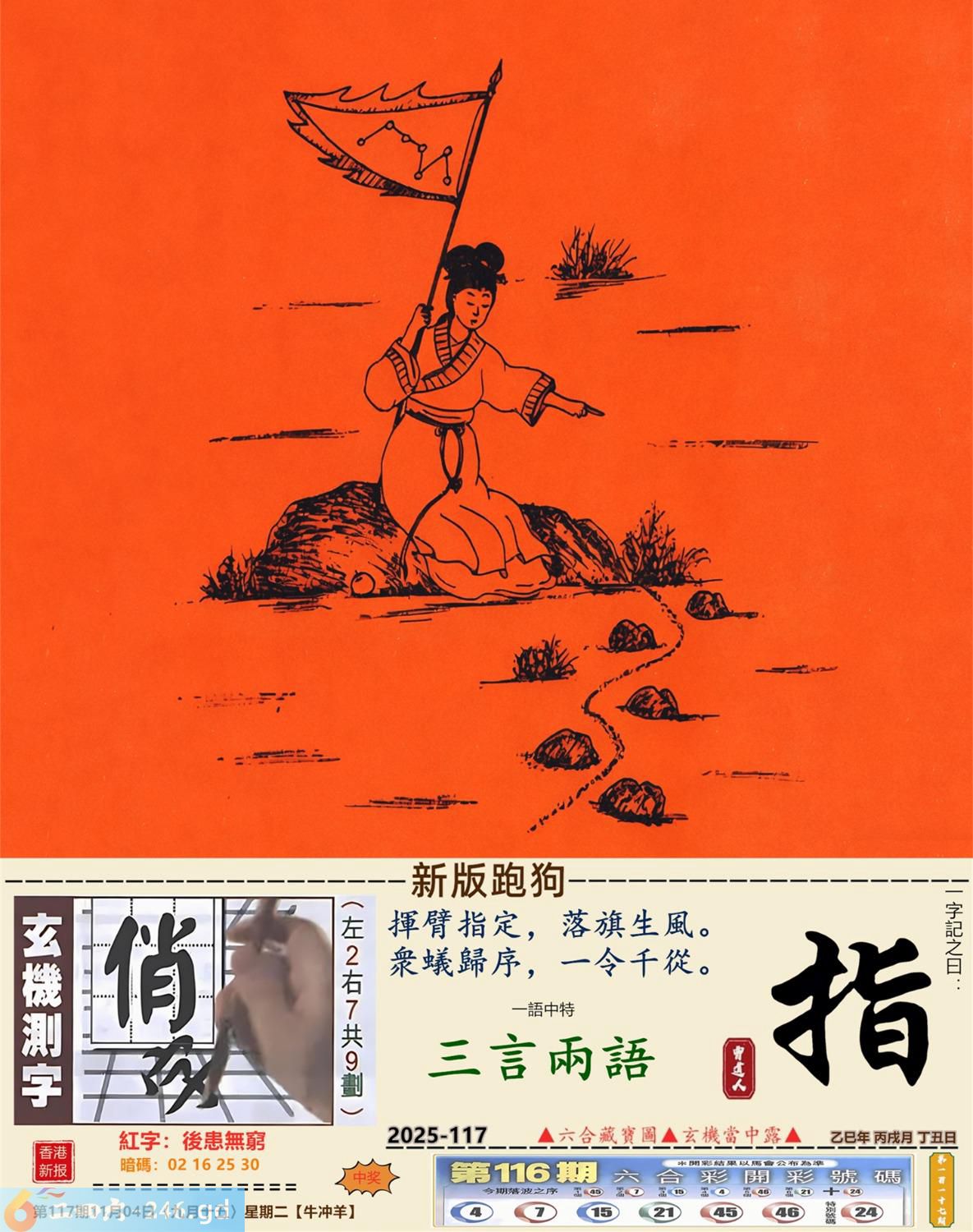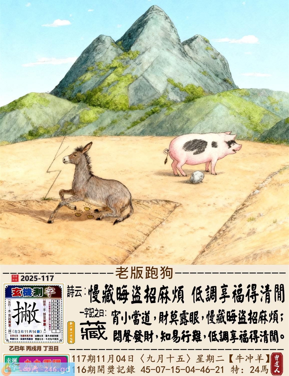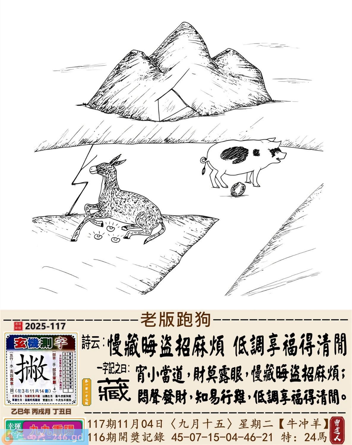2025年11月4日117期羊(辛未)(涧下水) 117期:老版跑狗玄機一字記之曰:【藏】 詩云:慢藏晦盜招麻煩低調享福得清閒 宵小當道,財莫露眼,慢藏晦盜招麻煩; 悶聲發財,知易行難,低調享福得清閒。 玄機測字:《撇》 密圖詩:點將臺上閱三軍 《記》:三五必須多留意 特碼大小單雙句:折花送佳人 今期必中:劉備 117期:特碼歇后語 掂着猪下水过独木桥-----提心吊胆 117期正版四字梅花诗:云里雾里。 117期火车头:烧伤龙。诗:蛇死猪伤,马到边尾看其数。 117期香港第一手欲钱料:三年? 117期曾道人说:“绿?” 117期另版四字梅花诗:长江滚滚。 117期香港第一手欲钱料:欲钱寻长寿的秘密。 117期曾道人说:“为什么游目骋怀最开怀呢”? 117期:二字經:向中 117期:袋子是特码 117期:智力金壤:完璧归赵 117期:信箱紅字:【後患無窮】 117期:【暗碼:02-16-25-30】 117期:一語中特:【三言兩語】 發財玄機圖:緊密相連呆若木頭圖中明雞紅藍 117期:藏寳圖 新:所得平时为郡乐 老:东南永作金天柱 禁:猪禁:2尾玄机字《湖》 2025年117期【生活幽默】版 〖你是約翰〗 約翰在機場侯機,閑來無聊站到一臺體重機上,熒屏上馬上出現“你是約翰,體重87公斤,飛往紐約。”的字樣。約翰十分驚奇,他十分鐘以後戴着墨鏡又站到這臺機器上,熒屏上馬上又顯出“你是約翰,體重87公斤,飛往紐約。” 約翰更加感到神奇了,他跑進洗手間刮掉胡子,换掉衣服又來到這機器前,焚屏上馬上顯出“你仍是約翰,你的體重仍是87公斤,你的飛機已于10分鐘前飛走了。”