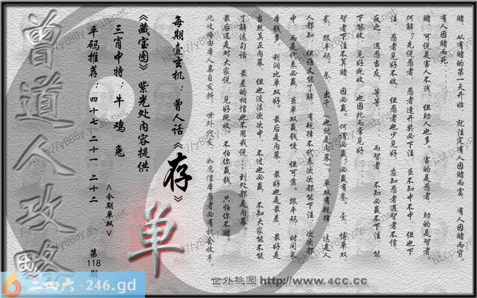118期藏寶圖 新:苏小门前万缕垂 老:伴人东去到江城 禁:羊禁:5尾玄機字:《存》