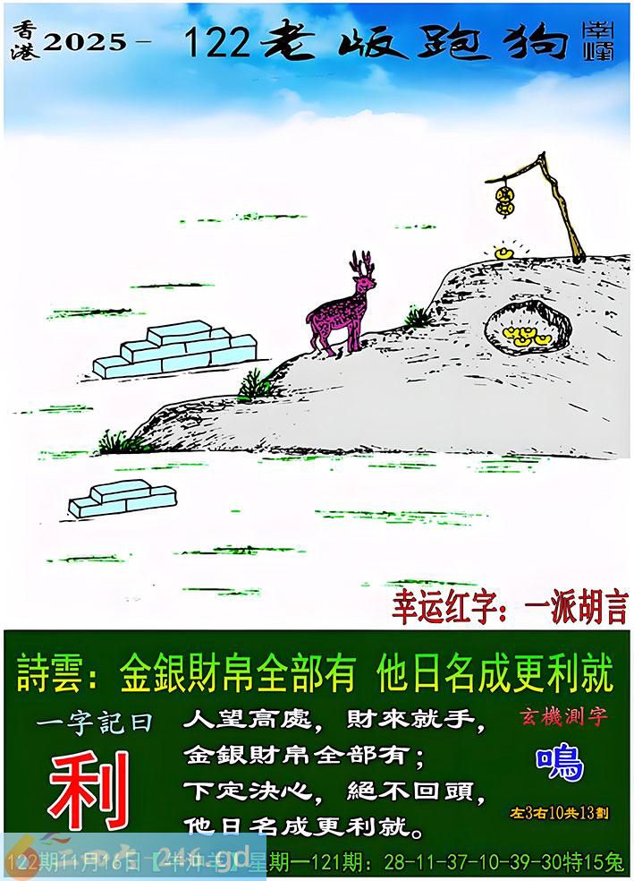 122期老版跑狗一字記之曰:【利】 詩雲:金銀財帛全部有,他日名成更利就。 人望高處,財來就手,金銀財帛全部有; 下定決心,絕不回頭,他日名成更利就。 玄機測字:《鳴》
