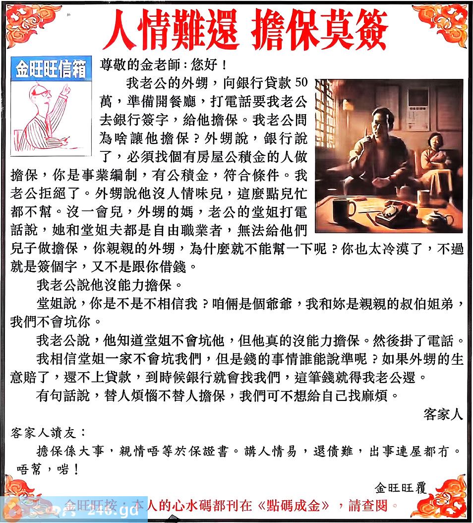 2025129期129期:金旺旺信箱彩民推荐→→《人情難還 擔保莫簽》