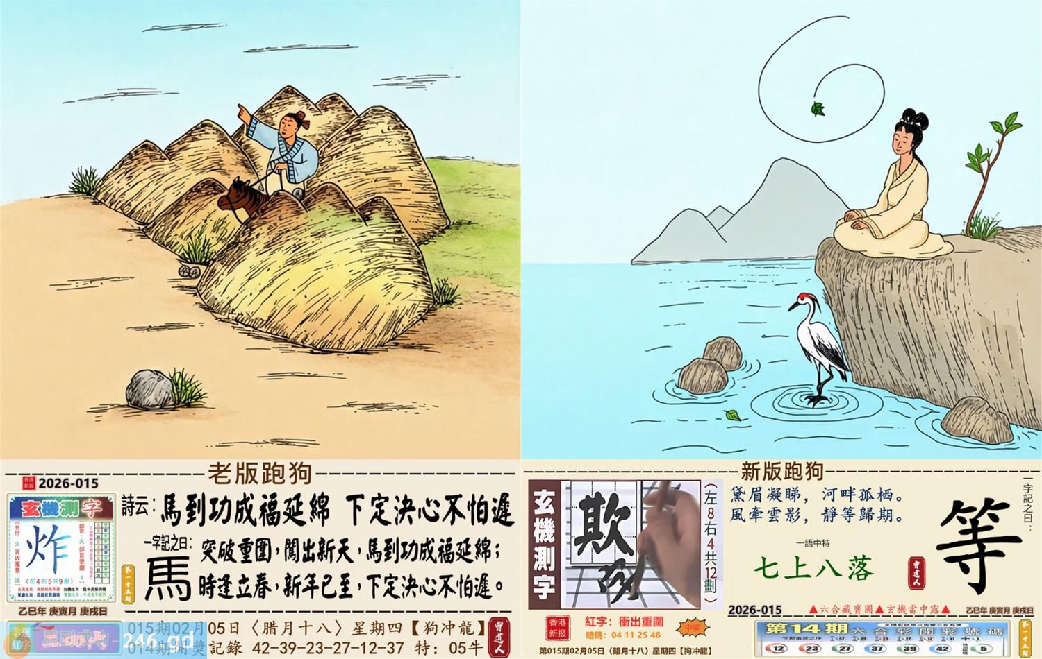 2026年2月5日015期龙(甲辰)(钗钏金) 015期:老版跑狗玄機一字記之曰:【馬】 詩云:馬到成功福延綿下定決心不怕遲 突破重圍,闖出新天,馬到成功福延綿; 時逢立春,新年已至,下定決心不怕遲。 玄機測字:《炸》 密圖詩:一臉家逼買三四 《記》:八面來風臘月會 特碼大小單雙句:小小買注二十塊 今期必中:馬岱 015期:特碼歇后語 嘴上无毛-----办事不牢 015期正版四字梅花诗:避而远之。 015期火车头:烧伤马。诗:鸡死狗伤,困龙暂且藏淤泥。 015期香港第一手欲钱料:二一。 015期曾道人说:“原油?” 015期另版四字梅花诗:四三发财。 015期香港第一手欲钱料:欲钱去看温柔可爱的动物。 015期曾道人说:“请问太阳为什么可以发电”? 015期:二字經:收藏 015期:面包是特码 015期:智力金壤;千钧一发 015期:信箱紅字:【衝出重圍】 015期:【暗碼:04-11-25-48】 015期:一語中特:【七上八落】 發財玄機圖:敏感非常弓身防禦圖中明蛇紅綠 015期:藏寶圖 新:蓬阁桃源两处分 老:江山王气空千劫 禁:马禁:7尾玄機字《象》 2026年015期【生活幽默】版 〖知音在此〗 某書生酷爱彈琴,常常感慨知音難尋,鬱鬱不樂。 一日在房中彈琴清遣,忽聞隔壁有嘆息之聲。書生大喜:"原來知音在此呀!" 歡歡喜喜地去鄰家叩門。開門的却是個老婦。老婦哭着説:"觸景生情啊,我兒子生前以彈棉花爲生,先生您彈的太像他了。"