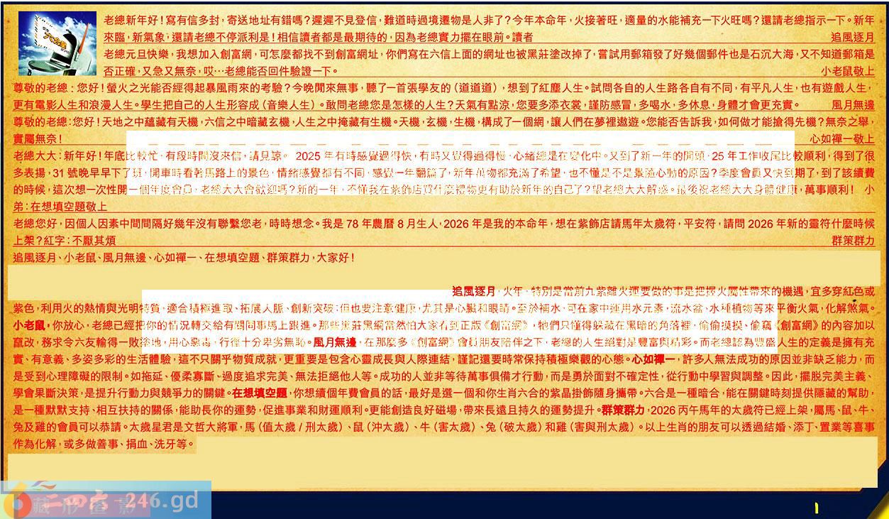 第009期《六合皇信箱文字版》10000%正確!!!正版二四六論壇*精心製作!!! 追風逐月、小老鼠、風月無邊、心如禪一、在想填空題、群策群力,大家好! 【1】.老總新年好!寫有信多封,寄送地址有錯嗎?遲遲不見登信,難道時過境遷物是人非了?今年本命年,火接著旺,適量的水能補充一下火旺嗎?還請老總指示一下。新年來臨,新氣象;還請老總不停派利是!相信讀者都是最期待的,因為老總實力擺在眼前。讀者追風逐月 〖追風逐月〗:火年,特別是當前九紫離火運要做的事是把握火屬性帶來的機遇,宜多穿紅色或紫色,利用火的熱情與光明特質,適合積極進取,拓展人脈、創新突破;但也要注意健康,尤其是心臟和眼睛。至於補水,可在家中運用水元素・流水盆、水種植物等來平衡火氣,化解煞氣。 【2】.老總元旦快樂,我想加入創富網,可怎麼都找不到創富網址,你們寫在六信上面的網址也被黑莊塗改掉了,嘗試用郵箱發了好幾個郵件也是石沉大海,又不知道郵箱是否正確,又急又無奈,哎...老總能否回件驗證一下。小老鼠敬上 〖小老鼠〗:你放心,老總已經把你的情況轉交給有關同事馬上跟進。那些黑莊黑網當然怕大家看到正版《創富網》,他們只懂得躲藏在黑暗的角落裡,偷偷摸摸、偷竊《創富網》的內容加以育改,務求令六友輪得一敗塗地,用心惡毒,行徑十分卑劣無恥。 【3】.尊敬的老總:您好!螢火之光能否經得起暴風雨來的考驗?今晚閒來無事,聽了一首張學友的(道道道),想到了紅麈人生。試問各自的人生路各自有不同,有平凡人生,也有遊戲人生,更有電影人生和浪漫人生。學生把自己的人生形容成(音樂人生)。敢問老總您是怎樣的人生?天氣有點涼,您要多添衣裳,謹防感冒,多喝水,多休息,身體才會更充實。風月無邊 〖風月無邊〗:在那麼多《創富網》會員朋友陪伴之下,老總的人生絕對是豊富與精彩。而老總認為豐盛人生的定義是擁有充實、有意義、多姿多彩的生活體驗,這不只關乎物質成就,更重要是包含心靈成長與人際連結,謹記邏要時常保持積極樂觀的心態。 【4】.尊敬的老總:您好!天地之中蕴藏有天機,六信之中暗藏玄機,人生之中掩藏有生機。天機,玄機,生機,構成了一個網,讓人們在夢裡遨遊。您能否告訴我,如何做才能搶得先機?無奈之舉實屬無奈!心如禪一敬上 〖心如禅一〗:許多人無法成功的原因並非缺乏能力,而是受到心理障礙的限制。如拖延、優柔寡斷、過度追求完美、無法拒絕他人等。成功的人並非等待萬事俱備才行動,而是勇於面對不確定性,從行動中學習與調整。因此,擺脱完美主義、學會果斷決策,是提升行動力與競爭力的關鍵。 【5】.老總大大:新年好!年底比較忙,有段時間沒來信,請見諒。2025年有時感覺過得快,有時又覺得過得慢心緒總是在變化中。又到了新一年的開頭,25年工作收尾比較順利,得到了很多表揚,31號晚早早下了班,開車時看著馬路上的景色,情緒感覺都有不同,感覺一年翻篇了新年萬物都充滿了希望,也不懂是不是景随隨心動的原因?季度會員又快到期了,到了該續费的時候,這次想一次性開一個年度會員,老總大大會歡迎嗎?新的一年,不懂我在紫飾店買什麼禮物更有助於新年的自己了?望老總大大解惑。最後祝老總大大身體健康,萬事順利!小弟:在想填空题敬上 〖在想填空題〗:你想續個年費會員的話,最好是選一個和你生肖六合的紫晶掛飾隨身捕帶。六合是一種暗合,能在關鍵時刻提供隱藏的幫助,是一種默默支持、相互扶持的關係,能助長你的運勢,促進事業和財運順利,更能創造良好磁場,带來長遠且持久的運勢提升。 【6】.老總您好,因個人因素中間間隔好幾年沒有聯繫您老,時時想念。我是78年農暦8月生人,2026年是我的本命年,想在紫飾店請馬年太歲符,平安符,請問2026年新的靈符什麼時候上架?紅字:不厥其煩群策群力 〖群策群力〗:2026丙午馬年的太歲符已經上架,屬馬、鼠、牛、兔及難的會員可以恭請。太歲星君是文哲大將軍,馬)值太歲/刑太歳、鼠(沖太歳)、牛(害太歲)、兔(破太歳)和雞(害與刑太歳)。以上生肖的朋友可以透過結婚、添丁、置業等喜事作為化解,或多做善事、捐血、洗牙等。 紅字:藏形匿影 暗码:11253849 [释义]指隐藏行迹,不让人知道。 [出处]《邓析子·无厚篇》:“为君者,藏形匿影,群下无私,掩目塞耳,万民恐震。”