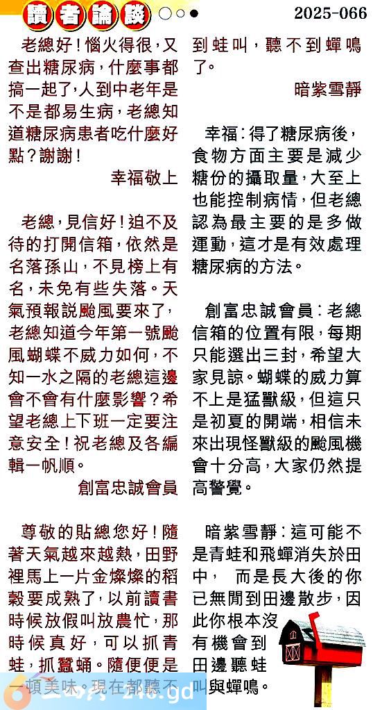 第零六六期讀者論談 1.老總好!惱火得很,又查出糖尿病,什麼事都搞一起了,人到中老年是不是都易生病,老總知道糖尿病患者吃什麼好點?謝謝!幸福敬上 〖幸福〗:得了糖尿病後,食物方面主要是减少糖份的攝取量,大至上也能控制病情,但老總認為最主要的是多做運動,這才是有效處理糖尿病的方法。 2.出老總,見信好!迫不及待的打開信箱,依然是名落孫山,不見榜上有名,未免有些失落。天氣預報說颱風要來了,老總知道今年第一號颱風蝴蝶不威力如何,不知一水之隔的老總這邊會不會有什麼影響?希望老總上下班一定要注意安全!祝老總及各編輯一帆順。創富忠誠會員 〖創富忠誠會員〗:老總信箱的位置有限,每期只能選出三封,希望大家見諒。蝴蝶的威力算不上是猛獸級,但這只是初夏的開端,相信未來出現怪獸級的颱風機會十分高,大家仍然提高警覺。 3.尊敬的貼總您好!隨著天氣越來越熱,田野裡馬上一片金燦燦的稻穀要成熟了,以前讀書時候放假叫放農忙,那時候真好,可以抓青蛙,抓蠶蛹。隨便便是一頓美味。現在都聽不到蛙叫,聽不到蟬鳴了。暗紫雪靜 〖暗紫雪靜〗:這可能不是青蛙和飛蟬消失於田中,而是長大後的你已無聞到田邊散步,因此你根本沒有機會到田邊聽蛙叫與蟬鳴。