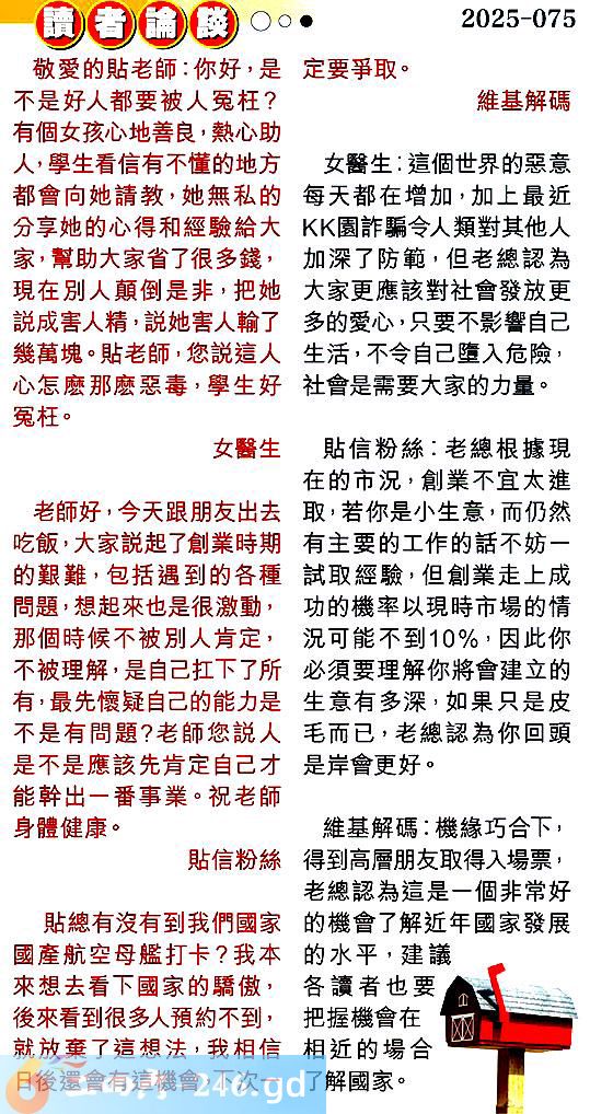 第零七五期讀者論談 1.敬愛的貼老師:你好,不是好人都要被人冤枉?有個女孩心地善良,熱心助人,學生看信有不懂的地方都會向她請教,她無私的分享她的心得和經驗給大家,幫助大家省了很多錢,現在別人顛倒是非,把她說成害人精,說她害人輸了幾萬塊。貼老師,您說這人心怎麽那麼惡毒,學生好冤枉。女醫生 〖女醫生〗:這個世界的惡意每天都在增加,加上最近園詐騙令人類對其他人加深了防範,但老總認為大家更應該對社會發放更多的爱心,只要不影響自己生活,不令自己墮入危險,社會是需要大家的力量。 2.老師好,今天跟朋友出去吃飯大家說起了創業時期的艱難,包括遇到的各種問题,想起來也是很激動,那個時候不被別人肯定,不被理解,是自己扛下了所有最先懷疑自己的能力是不是有問題?老師您說人是不是應該先肯定自己才能幹出一番事業。祝老師身體健康。貼信粉絲 〖貼信粉絲〗:老總根據現在的市況,創業不宜太進取,若你是小生意,而仍然有主要的工作的話不妨一試取經驗,但創業走上成功的機率以現時市場的情況可能不到10%,因此你必須要理解你將會建立的生意有多深,如果只是皮毛而已,老總認為你回頭是岸會更好。 3.貼總有沒有到我們國家國產航空母艦打卡?我本來想去看下國家的驕傲,後來看到很多人預約不到,就放棄了這想法,我相信日後還會有這機會,下次一定要爭取。維基解碼 〖維基解碼〗:機緣巧合下,得到高層朋友取得入場票,老總認為這是一個非常好的機會了解近年國家發展的水平,建議各讀者也要把握機會在相近的場合了解國家。