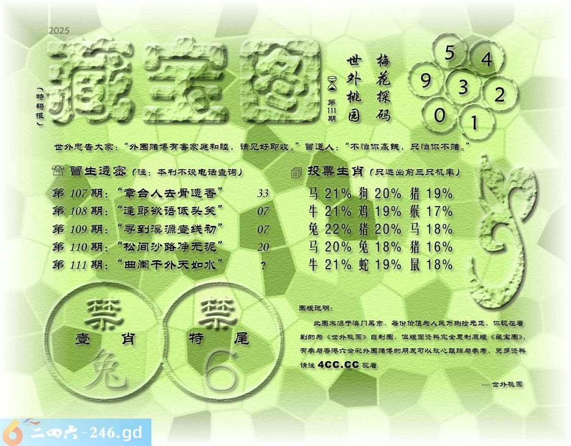 111期藏寶圖 新:始觉江山近故乡 老:曲阑干外天如水 禁:兔 禁:6尾 玄機字:《间》