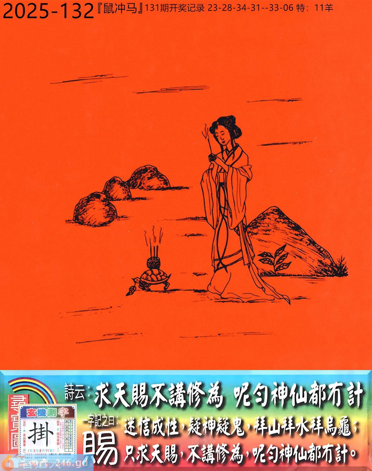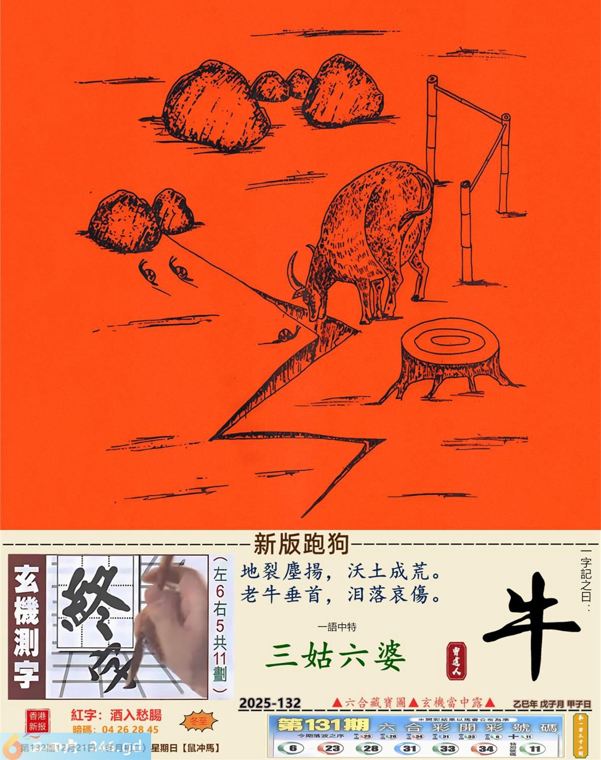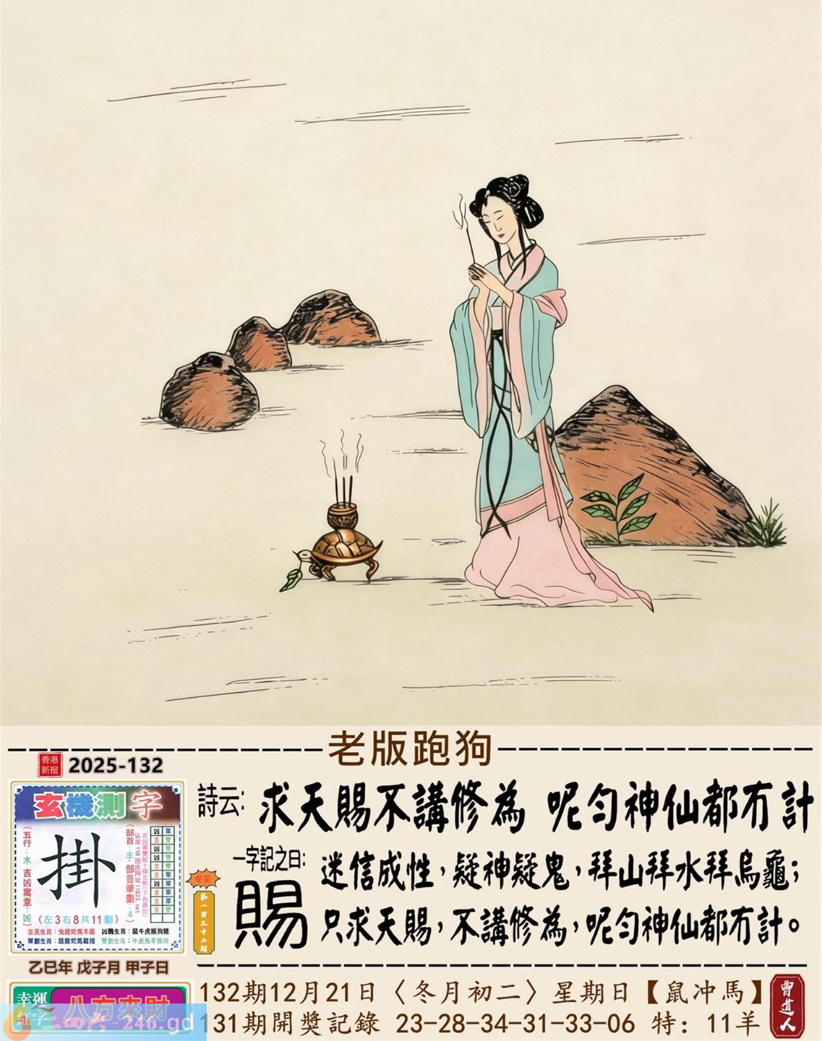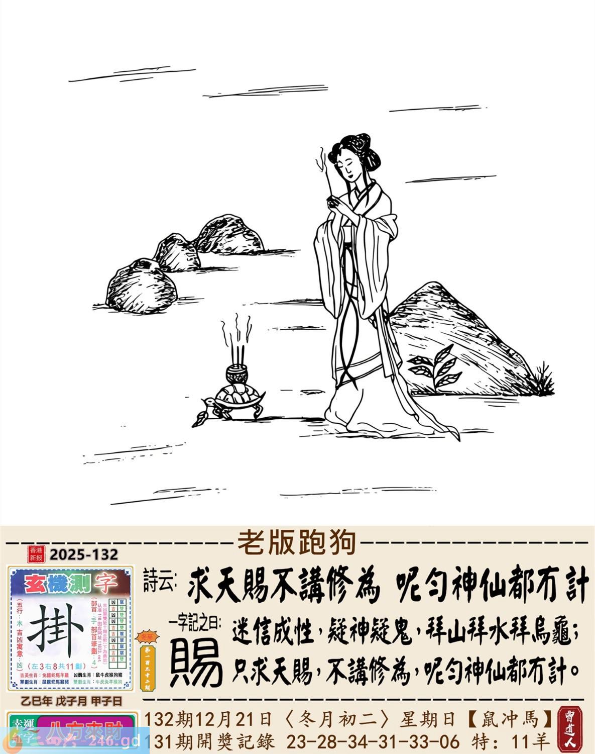 本帖最后由小歪于2025-12-2018:58编辑 2025年12月21日132期马(戊午)(海中金) 132期:老版跑狗玄機一字記之曰:【賜】 詩云:求天賜不講修為呢匀神仙都冇計 迷信成性,疑神疑鬼,拜山拜水拜烏龜; 只求天賜,不講修為,呢匀神仙都冇計。 玄機測字:《掛》 密圖詩:千金難買存光陰 《記》:不三不四是無賴 特碼大小單雙句:七上八下心惶惶 今期必中:馬超 132期:特碼歇后語 面具店失窃-----丢脸 132期正版四字梅花诗:步步为营。 132期火车头:烧伤马。诗:马死兔伤,三七出特今期来。 132期香港第一手欲钱料:惠州? 132期曾道人说:“大?” 132期另版四字梅花诗:大浪淘沙。 132期香港第一手欲钱料:欲钱看姜太公钓鱼。 132期曾道人说:“女人过年喜欢穿什么颜色的衣服”? 132期:二字經:不好 132期:天安门有特码 132期:智力金壤:炙手可热 132期:信箱紅字:【酒入愁腸】 132期:【暗碼:04-26-28-45】 132期:一語中特:【三姑六婆】 發財玄機圖:鳴聲響亮冠頂鮮紅圖中明雞藍綠 132期:藏寳圖 新:金缕香消春不管 老:留住玖华云壹片 禁:鼠禁:4尾玄機字《自》 2025年132期【生活幽默】版 〖禮貌地説〗 老師問:你約了心儀的女孩子吃晚餐,當你要上厕所時,該怎禮貌地? 同學:我去撇個尿!老師:這一點都不禮貌。 同學:我去上個厕所,等等回來。 老師:嗯,這個不錯,但還有更禮貌的。同學:容我離開一下。我去跟一個好朋友見個面。如果可以的話,我更希望今天晚上有機會介紹他給你認識。