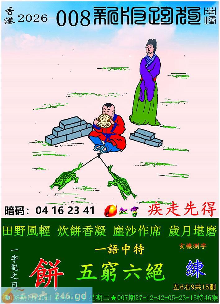 008期跑狗一字記之曰:【餅】 田野風輕,炊餅香凝。 塵沙作席,歲月堪磨。