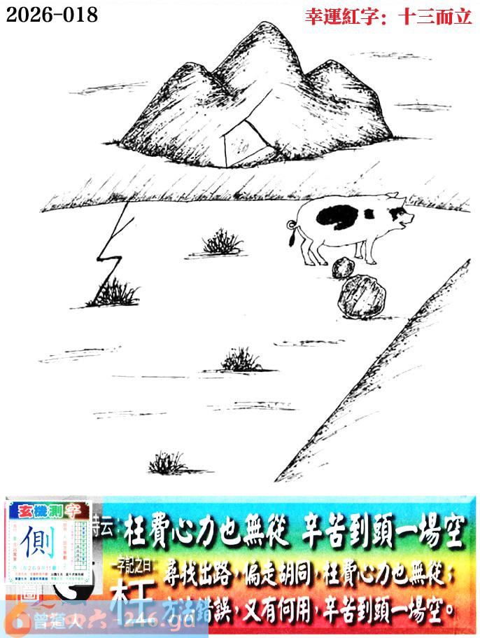 018期老版跑狗一字記之曰:【枉】 詩雲:枉費心力也無從,辛苦到頭一場空。 尋找出路,偏走胡同,枉費心力也無從; 方法錯誤,又有何用,辛苦到頭一場空。 玄機測字:《側》