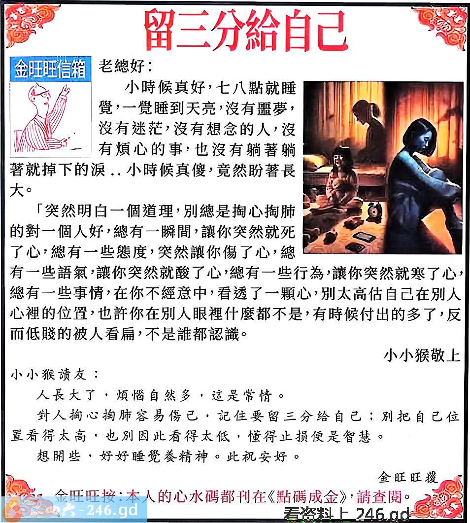 025期:金旺旺信箱彩民推荐→→《留三分給自己》