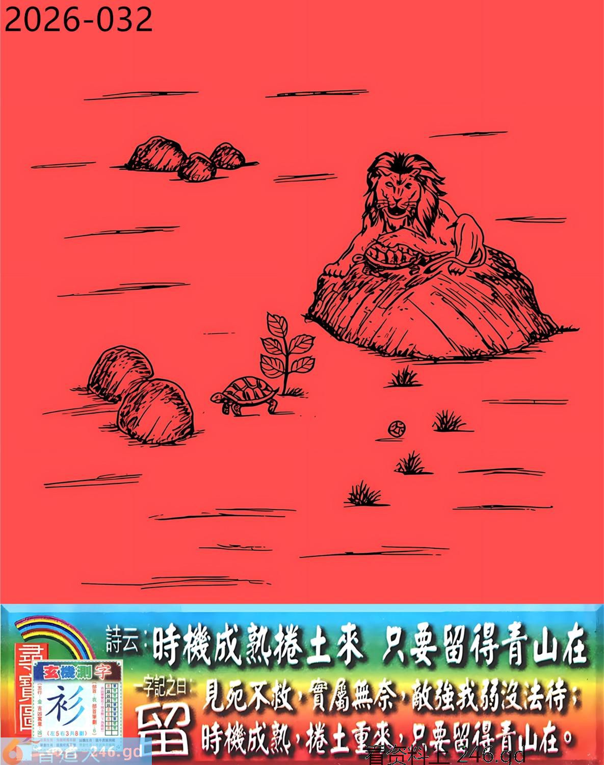 本帖最后由小歪于2026-3-2317:57编辑 2026年3月24日星期二山下火雞日沖兔 032期:老版跑狗玄機一字記之曰:【留】 詩云:時機成熟捲土來,只要留得青山在。 見死不救,實屬無奈,敵強我弱沒法待; 時機成熟,捲土重來,只要留得青山在。 玄機測字:《衫》 密圖詩:會上領導一席話 記:八仙賀喜到門前 特碼大小單雙句:小打小鬧 今期必中:孫權 032期:特碼歇后語 过时的药----失效了 032期正版四字梅花诗:满头大汗。 032期火车头:烧伤马。诗:龙死鸡伤,三六两边二一来。 032期香港第一手欲钱料:三天打鱼?。 032期曾道人说:“蛇?” 032期另版四字梅花诗:没事找事。 032期香港第一手欲钱料:欲钱看小学生做早操的样子。 032期曾道人说:“怎么样的男人对美女最感兴趣”? 032期:二字经:绿红。 032期:大门有特码 032期:智力金壤:來龍去脈 030期:信箱紅字:【不伏燒埋】 030期:【暗碼:05313339】 030期:一語中特:【五光十色】 發財玄機圖:預備進攻頸部抬起圖中明蛇紅綠 032期:藏寶圖 新:大耳胡僧同笑语 老:玖天开出壹成都 禁:牛禁:9尾玄機字《韶》 2026年032期【生活幽默】版 〖藥方〗 一位七十歲的老人向醫生訴說自己的困境:"最近我和一位二十六歲的美麗女郎結了婚,但每晚衹要一上床,我很快就會睡去。" 醫生草草開了一張藥方,遞給病人。病人的臉上露出喜氣:"醫生,你的意思是我能够......" "不,"醫生打斷了他,"這藥是給她的,我對你無能爲力,但至少必須讓她也能睡得着。"