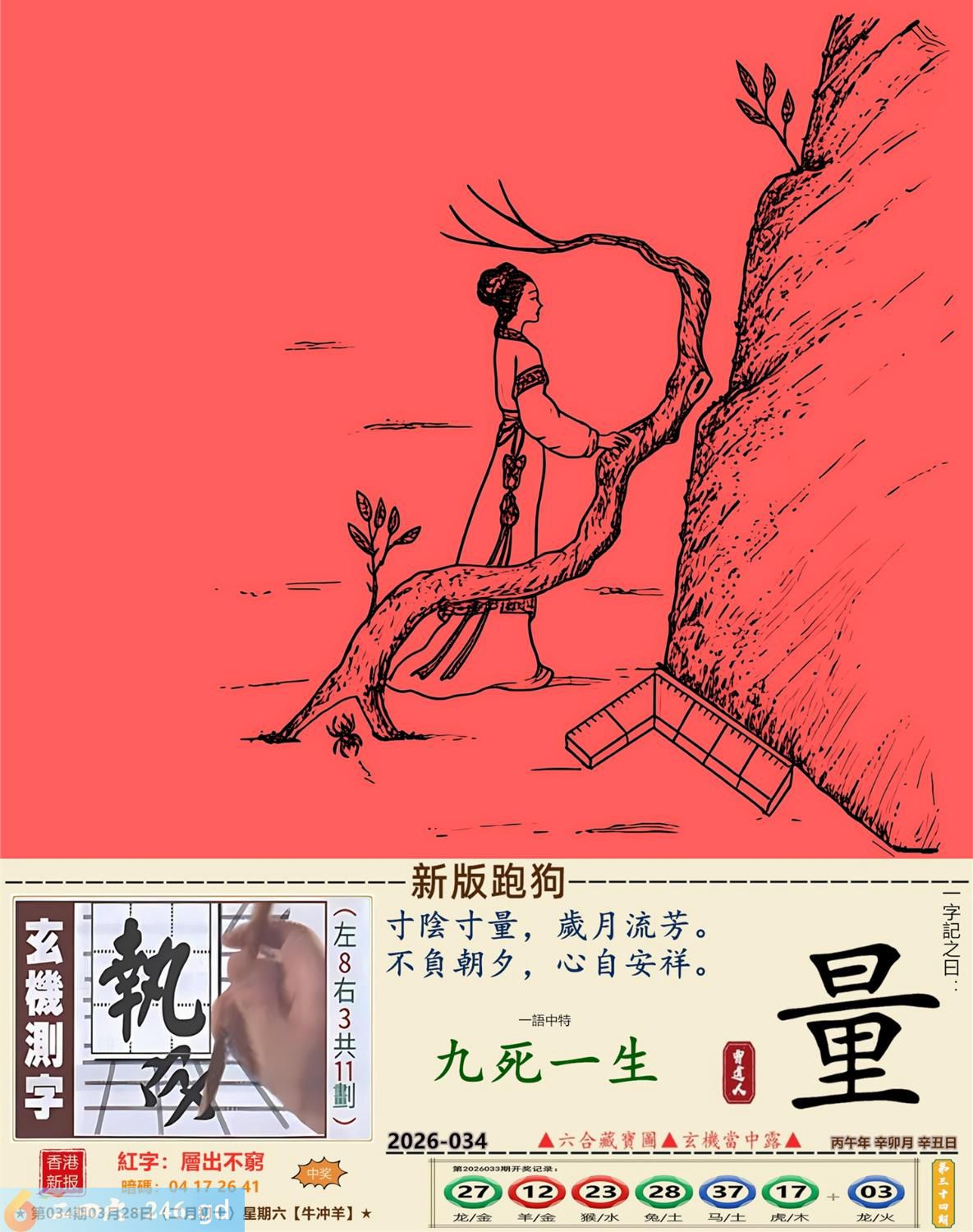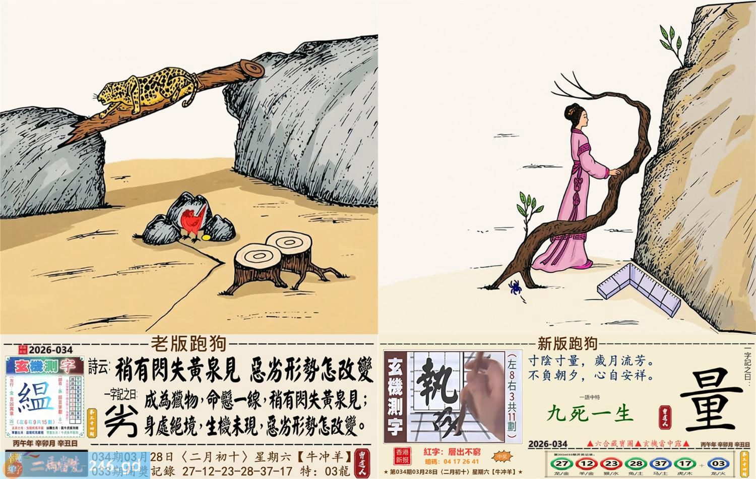 2026年3月28日星期六壁上土牛日冲羊 034期:老版跑狗玄機一字記之曰:【劣】 詩云:稍有閃失黃泉見,惡劣形勢怎改變。 成為獵物,命懸一線,稍有閃失黃泉見; 身處絕境,生機未現,惡劣形勢怎改變。 玄機測字:《緼》 密圖詩:一二好運伴八在 記:三人玩耍最開心 特碼大小單雙句:一山不能容二虎 今期必中:貂蟬 034期:特碼歇后語 敲碎的铜锣-----名(鸣)声不 034期正版四字梅花诗:破旧立新。 034期火车头:烧伤狗。诗:猴死龙伤,无穷二四过一边。 034期香港第一手欲钱料:石头? 034期曾道人说:“龙?” 034期另版四字梅花诗:疯癫和尚。 034期香港第一手欲钱料:欲钱世界选美大赛的结果。 034期曾道人说:“为什么母爱最伟大”? 034期:二字经:红绿。 034期:辣辣是特码 034期智力金壤:胡言乱语 紅字:【層出不窮】 暗码:【04172641】 發財玄機圖:探索周圍儲備充足圖中明鼠藍綠 034期:藏寳圖 新:瘦影自临春水照 老:诗卷长留天地间 禁:鸡禁:0尾玄机字《霜》 2026年034期【生活幽默】版 〖長大了要像爸爸一樣〗 一家人坐在沙發上看電視,突然兒子:"爸爸,我長大了要像你一樣!" 媽媽:"兒子,你想像爸爸什呀?"爸爸聽後得意地笑道:"怎樣,老婆,我還是很優秀的?"轉頭問兒子:"兒子,説説像爸爸什麼?" 兒子:"像你一樣,每天可以和媽媽要十塊錢零花錢!" 爸爸:"......"