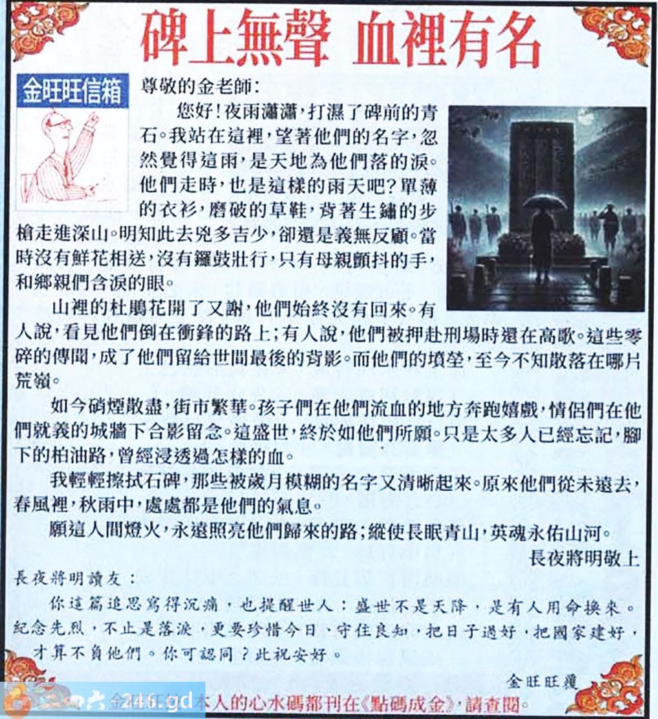 046期:金旺旺信箱彩民推荐→→《碑上無聲 血裡有名》