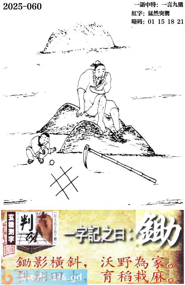 060期跑狗一字記之曰:【鋤】 鋤影橫斜,沃野為家。 耕翻田土,育稻栽麻。 玄機測字:《判》 一語中特:一言九鼎
