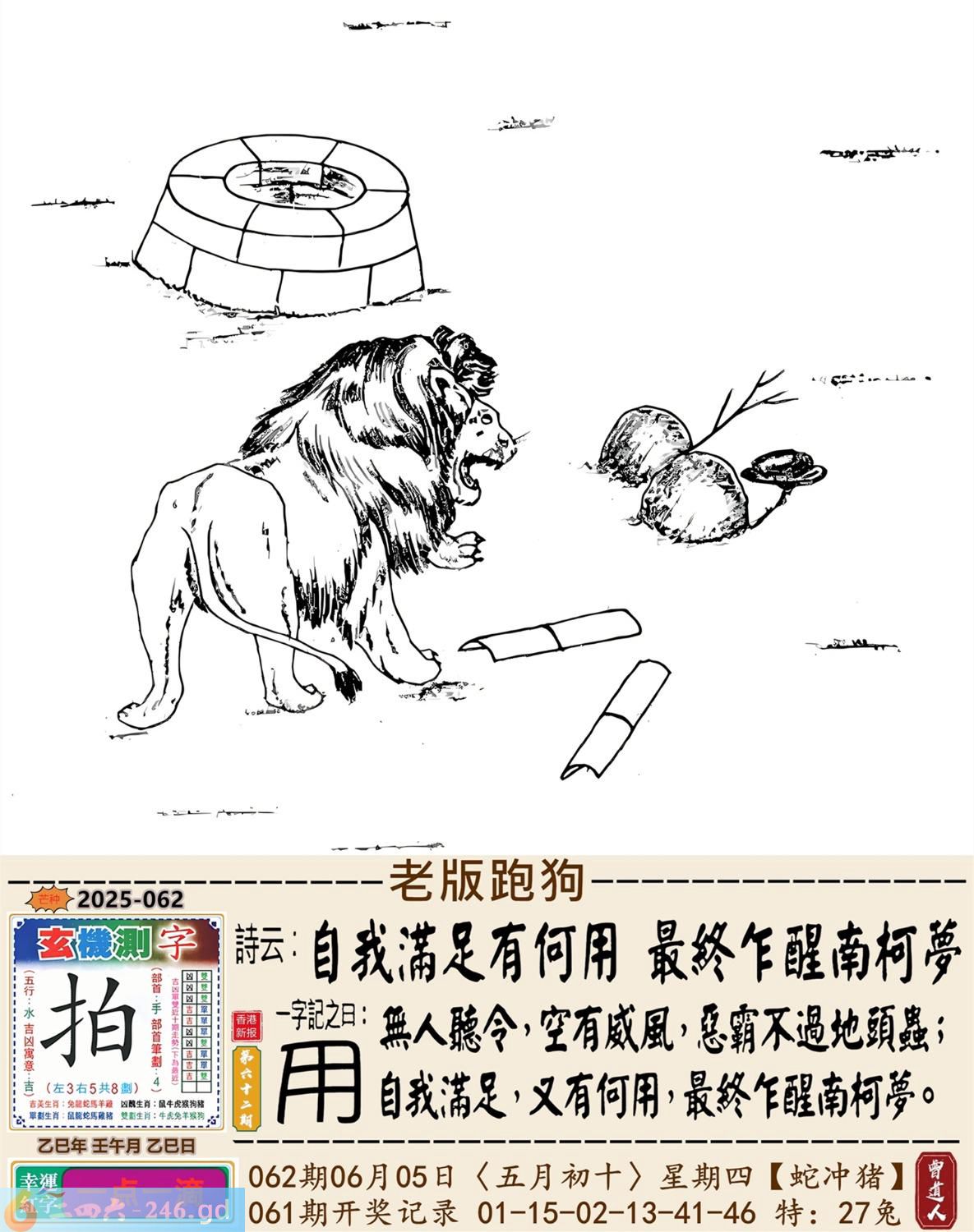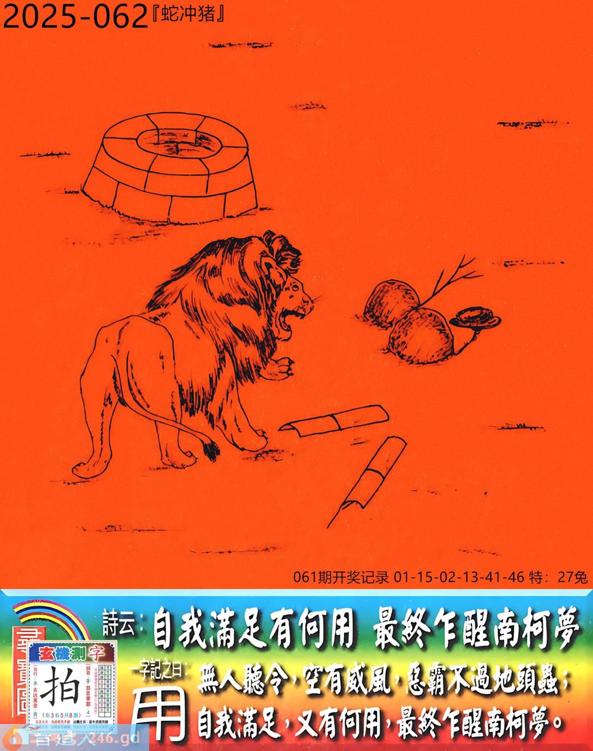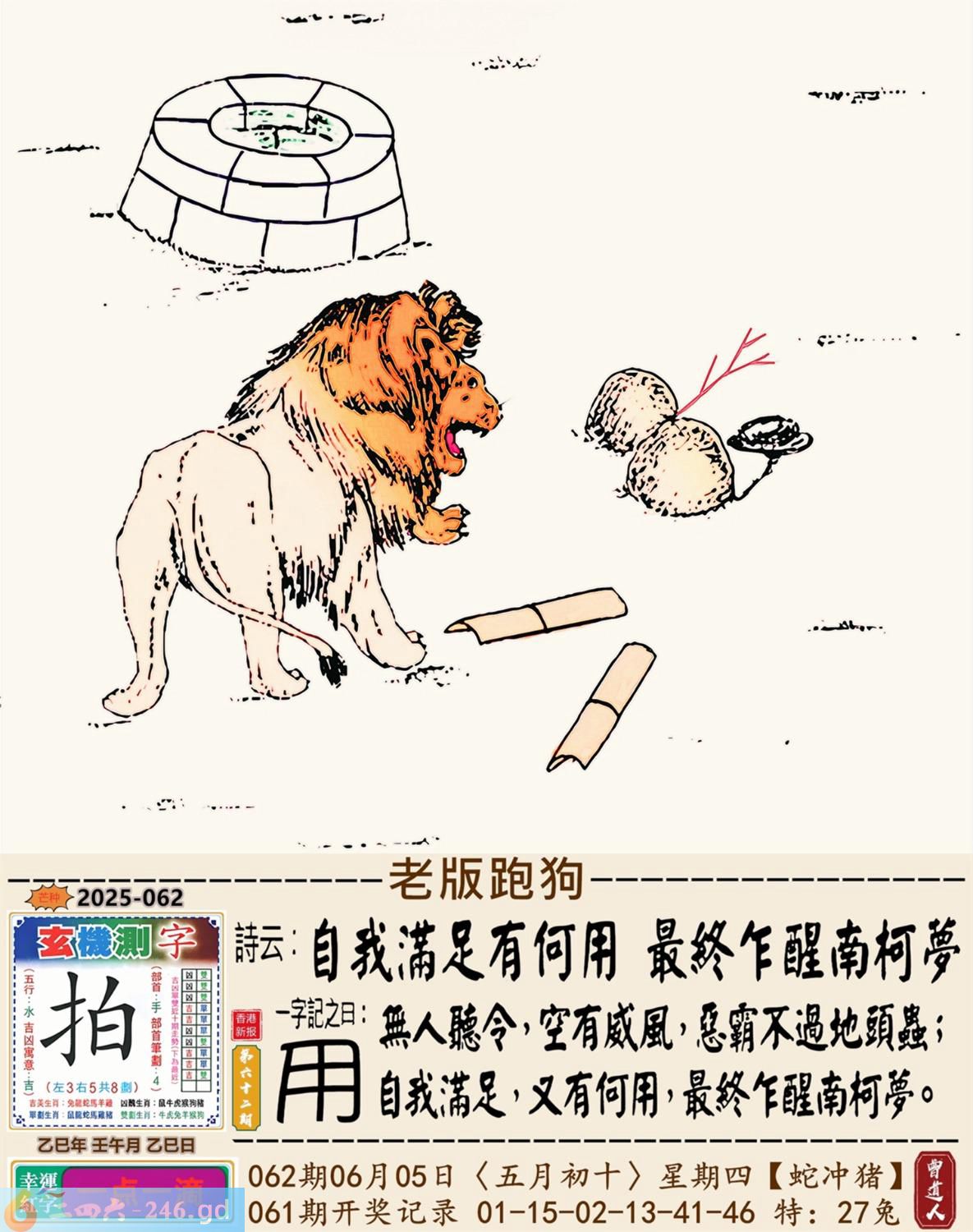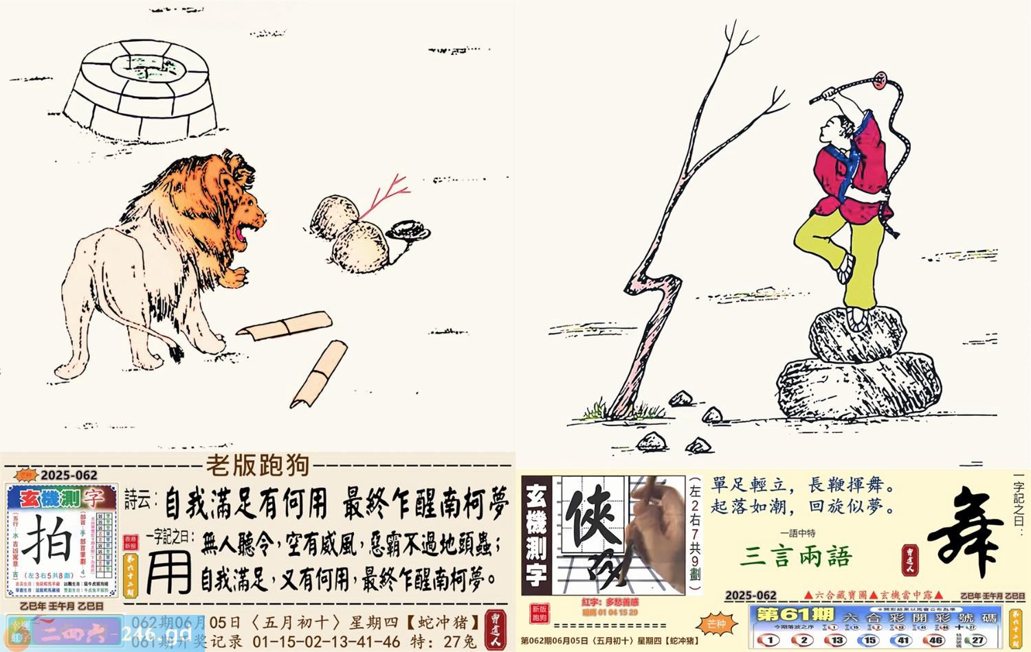 2025年6月5日062期猪(己亥)(覆灯火) 062期:老版跑狗玄機一字記之曰:【用】 詩云:自我滿足有何用,最終乍醒南柯夢。 無人聽令,空有威風,惡霸不過地頭蟲; 自我滿足,又有何用,最終乍醒南柯夢。 玄機測字:《拍》 密圖詩:一方熱來一方冷 《記》:落入平川斷其尾 特碼大小單雙句:今期看單來發財 今期必中:曹操 062期:特碼歇后語 火车拉长笛-----越想(响)越有气 062期正版四字梅花诗:左顾右盼。 062期火车头:烧伤猪。诗:猴死马伤,本期看好二三肖。 062期香港第一手欲钱料:有机可乘? 062期曾道人说:“大?” 062期另版四字梅花:一前三后。 062期香港第一手欲钱料:欲钱看连战访问大陆的人数。 062期曾道人说:“女人十八经常会说什么没有一撇”? 062期:二字經:牛頭 062期:神仙是特码 062期:智力金壤:异想天开 062期:信箱紅字:【多愁善感】 062期:【暗碼:01-04-15-29】 062期:一語中特:【三言兩語】 發財玄機圖:外強中乾曲折小路圖中明羊藍綠 062期:藏寳圖 新:饯郭林宗数千两 老:风微烟淡雨萧然 禁:猴禁:5尾玄机字《虚》 2025年062期【生活幽默】版 〖印第安部落〗 有一天,村長、鎮長、鄉長被抓到了印第安部落,印第安首領說:“你們去撿一樣東西回來,不然就殺了你們!” 不一會,村長撿了個玻璃球回來,印第安首領將玻璃球塞到了村長的屁股裏。這時,鎮長也回來了,鎮長撿了個木棒回來,印第安首領也同樣塞到了鎮長的屁股裏。最後鄉長也回來了,這裹的鄉長,手裏拿來了一棵仙人掌。