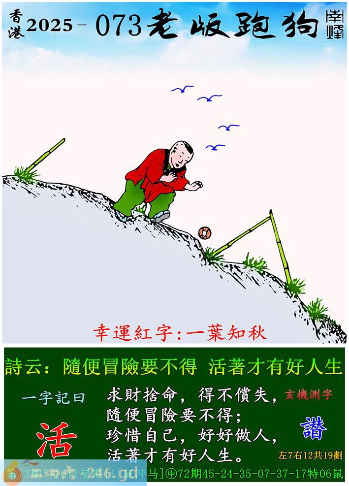 073期老版跑狗一字記之曰:【活】 詩雲:隨便冒險要不得,活著才有好人生。