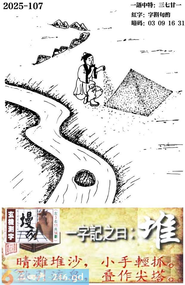 107期跑狗一字記之曰:【堆】 晴灘堆沙,小手輕抓。 慾引流泉,疊作尖塔。 玄機測字:【墁】 一語中特:三七甘一