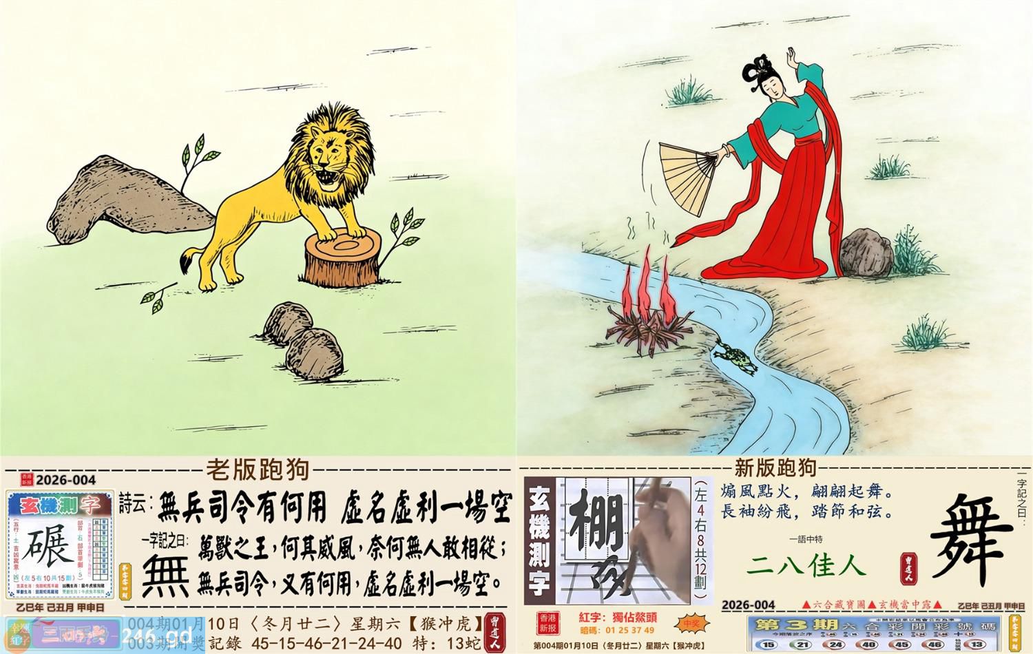 2026年1月10日004期虎(戊寅)(泉中水) 004期:老版跑狗玄機一字記之曰:【無】 詩云:無兵司令有何用虛名虛利一場空 萬獸之王,何其威風,奈何無人敢相從; 無兵司令,又有何用,虛名虛利一場空。 玄機測字:《碾》 密圖詩:一對核桃一對棗 《記》:試看中有玉兔 特碼大小單雙句:伸手要錢 今期必中:黄月英 004期:特碼歇后語 葵花的盘子-----老转向 004期正版四字梅花诗:涉险过关。 004期火车头:烧伤马。诗:羊死龙伤,四书五经读一生。 004期香港第一手欲钱料:一。 004期曾道人说:“人?” 004期另版四字梅花诗:七十二变。 004期香港第一手欲钱料:欲钱找世界最高楼。 004期曾道人说:“为什么现代的人喜欢赌博”? 004期:二字經:帶頭 004期:白头翁是特码 004期:智力金壤:春和景明 004期:信箱紅字:【獨占鰲頭】 004期:【暗碼:01-25-37-49】 004期:一語中特:【二八佳人】 發財玄機圖:伺機而動狡猾敏捷圖中明蛇鼠藍綠 004期:藏寳圖 新:天教谪入群花苑 老:乌蒙磅礴走泥丸 禁:狗禁:1尾玄机字《收》 2026年004期【生活幽默】版 〖精神病院〗 一精神病院裏,院長想看看他的病人到了什程度,就在他們面前放了一祗兔子。 第一個病人上去:"駕!駕!駕!" 第二個病人:"駕,快去追他!"院長無奈地嘆了口氣。 此時,院長看見第三個病人在那一直摸那衹兔子,滿意地點了點頭。没想到那個病人却説: "小樣,先讓你們300米,等我擦完車再説。"