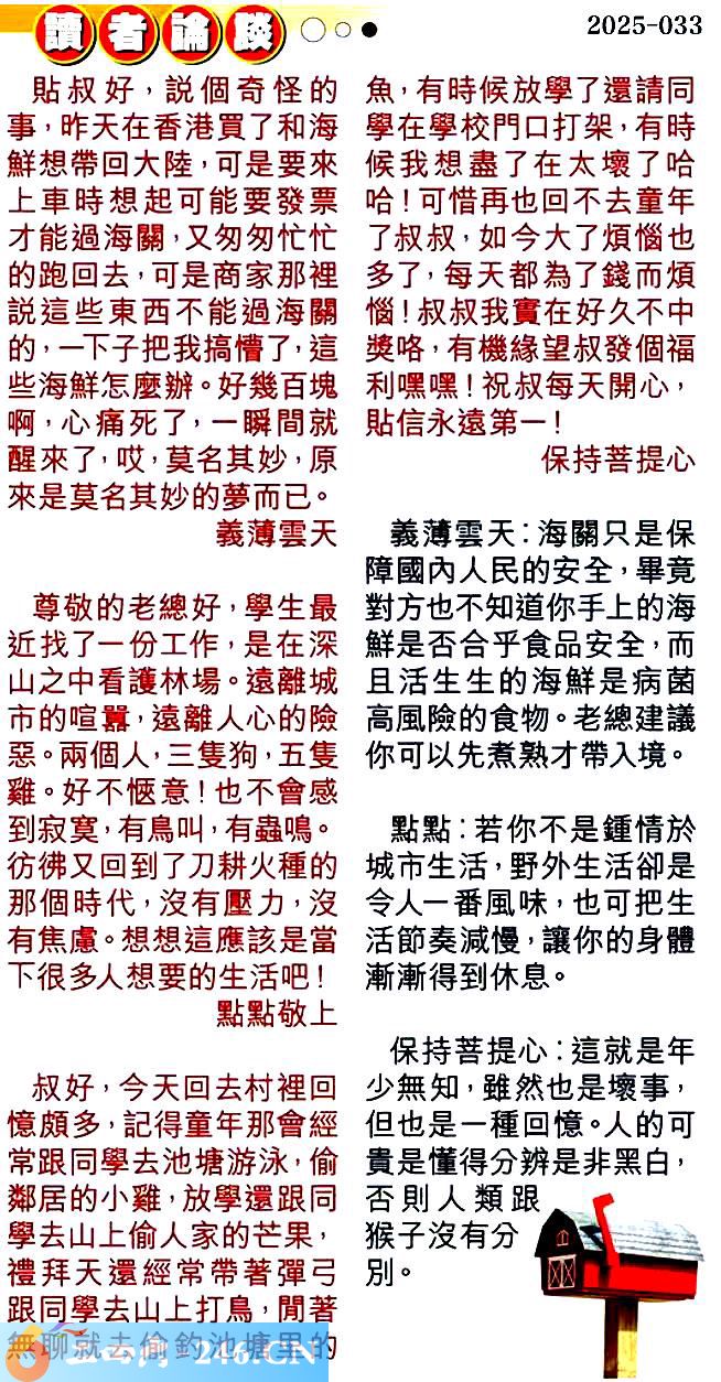 第零三三期讀者論談 1.貼叔好,說個奇怪的事,昨天在香港買了和海鮮想帶回大陸,可是要來上車時想起可能要發票才能過海關,又匆匆忙忙的跑回去,可是商家那裡說這些東西不能過海關的,一下子把我搞懵了,這些海鮮怎麼辦好幾百塊啊,心痛死了,一瞬間就醒來了,哎,莫名其妙,原來是莫名其妙的夢而已。義薄雲天 〖義薄雲天〗:海關只是保障國內人民的安全,畢竟對方也不知道你手上的海鮮是否合乎食品安全,而且活生生的海鮮是病菌高風險的食物。老總建議你可以先煮熟才帶入境。 2.尊敬的老總好,學生最近找了一份工作,是在深山之中看護林場。遠離城市的喧囂,遠離人心的險惡。兩個人三隻狗,五隻雞。好不愜意!也不會感到寂寞,有鳥叫,有蟲鳴。彷佛又回到了刀耕火種的那個時代,沒有壓力,沒有焦慮。想想這應該是當下很多人想要的生活吧!點點敬上 〖點點〗:若你不是鍾情於城市生活,野外生活卻是令人一番風味,也可把生活節奏減慢,讓你的身體漸漸得到休息。 3.叔好,今天回去村裡回憶頗多,記得童年那會經常跟同學去池塘游泳,偷鄰居的小雞,放學還跟同學去山上偷人家的芒果,禮拜天還經常帶著彈弓跟同學去山上打鳥,閒著無聊就去偷釣池塘里的魚,有時候放學了還請同學在學校門口打架,有時)候我想盡了在太壞了哈哈!可惜再也回不去童年了叔叔,如今大了煩惱也多了,每天都為了錢而煩惱!叔叔我實在好久不中獎咯,有機緣望叔發個福利嘿嘿!祝叔每天開心,貼信永遠第一!保持菩提心 〖保持菩提心〗:這就是年少無知,雖然也是壞事,但也是一種回憶。人的可貴是懂得分辨是非黑白,否則人類跟猴子沒有分別。