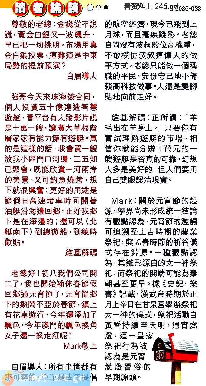 2026022期022期:彩民推荐〖貼信讀者論壇〗