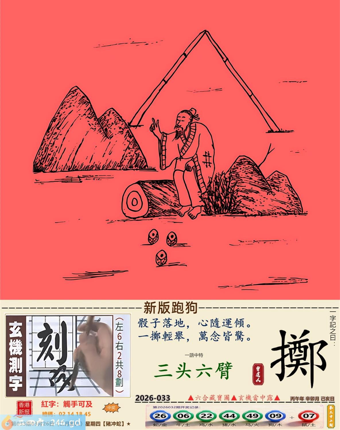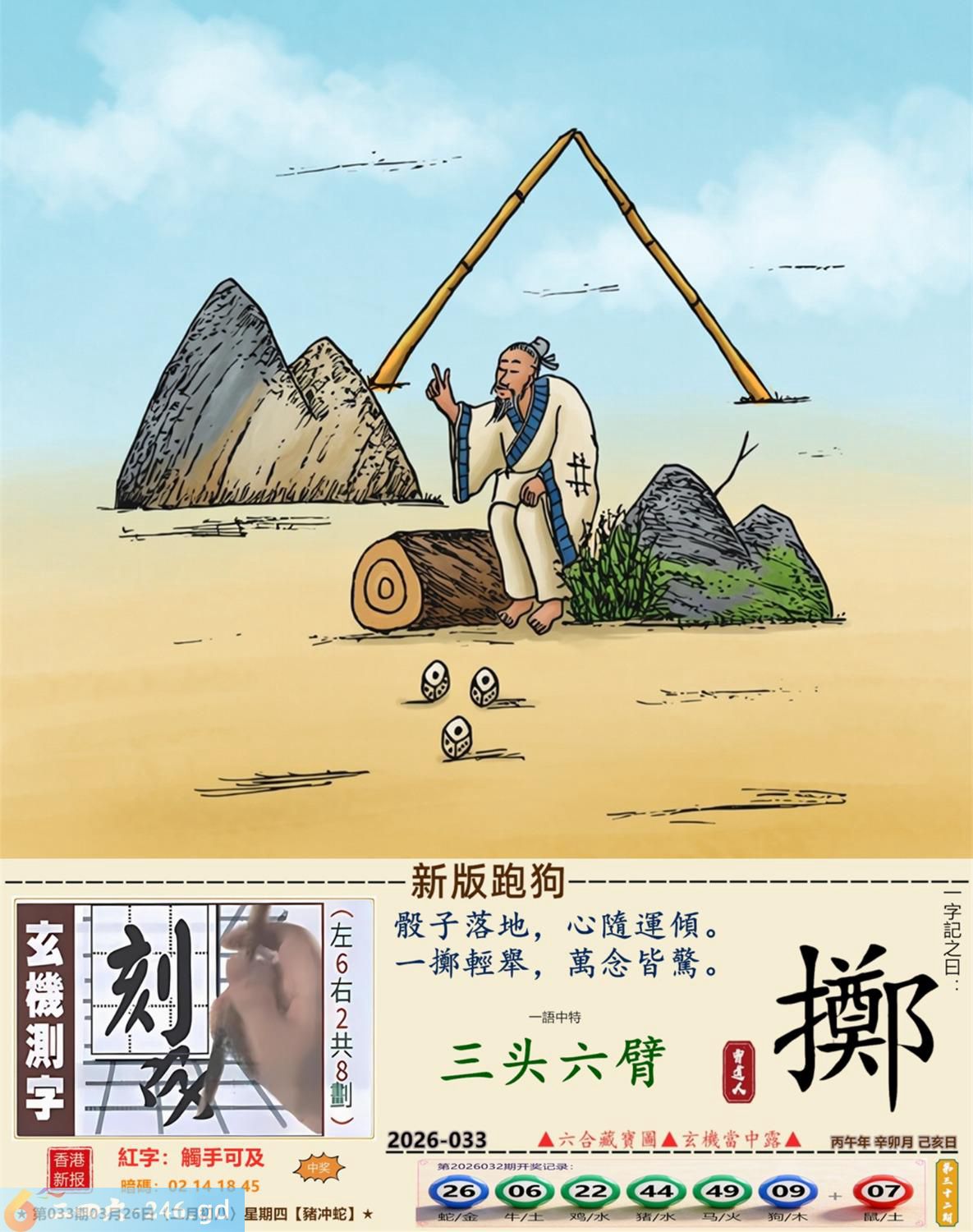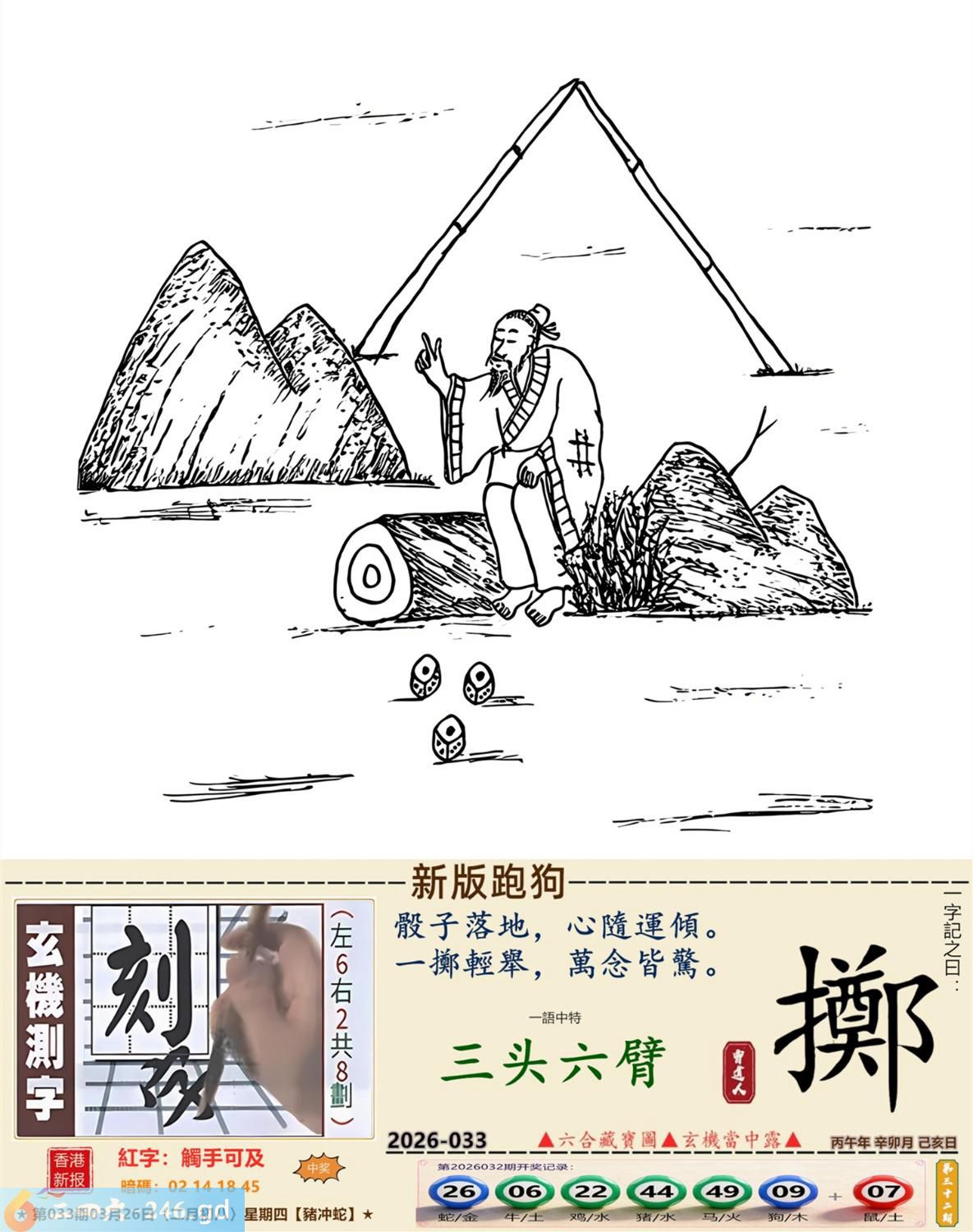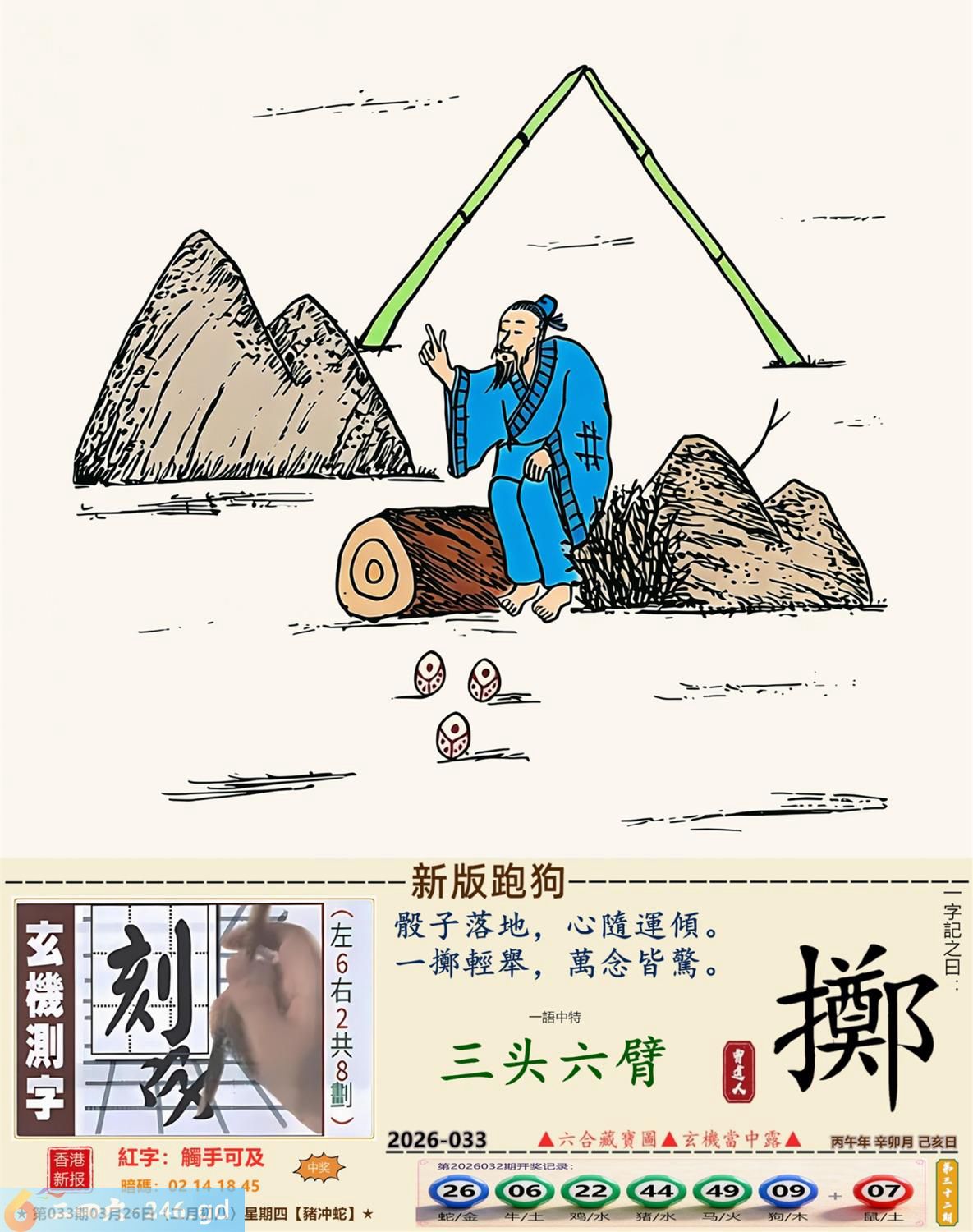 本帖最后由小歪于2026-3-2610:50编辑 3月26日星期四平地木豬日沖蛇 033期:老版跑狗玄機一字記之曰:【走】 詩云:君子不立危牆下,走為上招逢凶化。 凶險當前,不宜硬碰,君子不立危牆下; 避其鋒劫,不要沖動,走為上招逢凶化。 玄機測字:《湍》 密圖詩:方圓十里無客棧 記:一八相伴漏紅珠 特碼大小單雙句:長話短說 今期必中:關羽 033期:特碼歇后語 秦始皇修长城-----功过后人评 033期正版四字梅花诗:炊沙成饭。 033期火车头:烧伤龙。诗:蛇死猪伤,马到边尾看其数。 033期香港第一手欲钱料:水? 033期曾道人说:“三人?” 033期另版四字梅花诗:青山绿水。 033期香港第一手欲钱料:欲钱看跑得快的生肖。 033期曾道人说:“为什么初恋的情人总比较难忘”? 033期:二字经:绿蓝。 033期:恐龙是特码 033期智力金壤:功败垂成 033期紅字:【觸手可及】 033期暗码:【02141845】 033期一語中特:【三頭六臂】 發財玄機圖:持笛吹奏席地而坐圖中明蛇紅藍 033期:藏寶圖 新:竹移不问醉与迷 老:惹窗映竹满炉烟 禁:蛇禁:8尾玄機字《要》 2026年033期【生活幽默】版 〖出軌〗 小麗嫁给了富二代。不久後富二代出軌了,而且臭名遠揚。小麗十分生氣,質問老公:“真没有看出你是侗流男,怪我瞎了眼!” 富二代很平静:“我這一切都是為你啊!”小麗:“為我?" 富二代十分認真:“你長相雖好、可智商平庸,又没有什麼什麼特殊才能,祗因貪戀富贵嫁到我家裹,别人一直在背後戳你脊梁骨,説你道德不端,在家裹你也根本没有地位,對吧!現在我出軌成了渣男,你翻身了!”