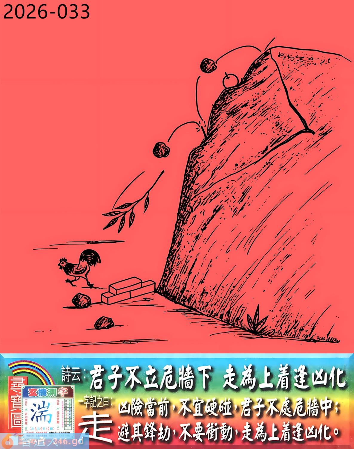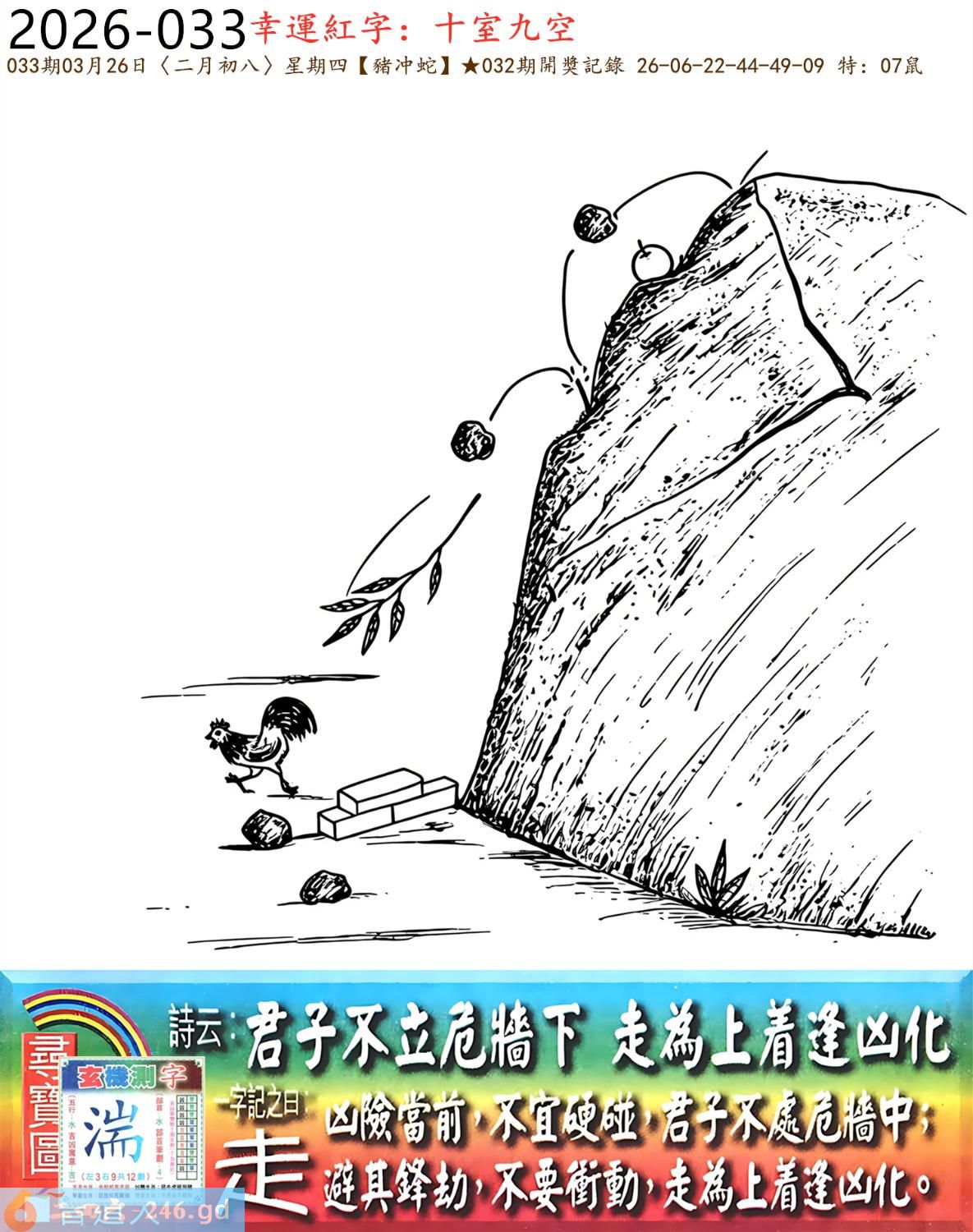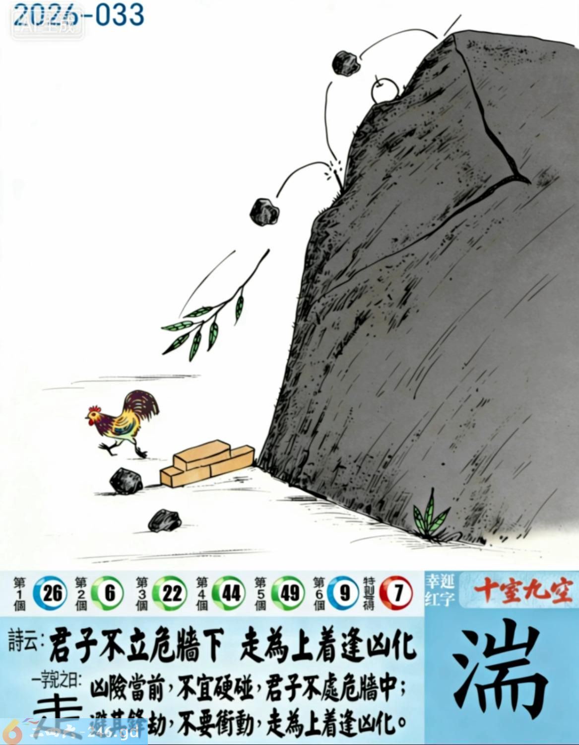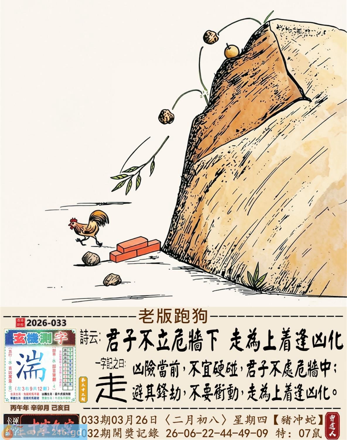 本帖最后由小歪于2026-3-2610:50编辑 3月26日星期四平地木豬日沖蛇 033期:老版跑狗玄機一字記之曰:【走】 詩云:君子不立危牆下,走為上招逢凶化。 凶險當前,不宜硬碰,君子不立危牆下; 避其鋒劫,不要沖動,走為上招逢凶化。 玄機測字:《湍》 密圖詩:方圓十里無客棧 記:一八相伴漏紅珠 特碼大小單雙句:長話短說 今期必中:關羽 033期:特碼歇后語 秦始皇修长城-----功过后人评 033期正版四字梅花诗:炊沙成饭。 033期火车头:烧伤龙。诗:蛇死猪伤,马到边尾看其数。 033期香港第一手欲钱料:水? 033期曾道人说:“三人?” 033期另版四字梅花诗:青山绿水。 033期香港第一手欲钱料:欲钱看跑得快的生肖。 033期曾道人说:“为什么初恋的情人总比较难忘”? 033期:二字经:绿蓝。 033期:恐龙是特码 033期智力金壤:功败垂成 033期紅字:【觸手可及】 033期暗码:【02141845】 033期一語中特:【三頭六臂】 發財玄機圖:持笛吹奏席地而坐圖中明蛇紅藍 033期:藏寶圖 新:竹移不问醉与迷 老:惹窗映竹满炉烟 禁:蛇禁:8尾玄機字《要》 2026年033期【生活幽默】版 〖出軌〗 小麗嫁给了富二代。不久後富二代出軌了,而且臭名遠揚。小麗十分生氣,質問老公:“真没有看出你是侗流男,怪我瞎了眼!” 富二代很平静:“我這一切都是為你啊!”小麗:“為我?" 富二代十分認真:“你長相雖好、可智商平庸,又没有什麼什麼特殊才能,祗因貪戀富贵嫁到我家裹,别人一直在背後戳你脊梁骨,説你道德不端,在家裹你也根本没有地位,對吧!現在我出軌成了渣男,你翻身了!”