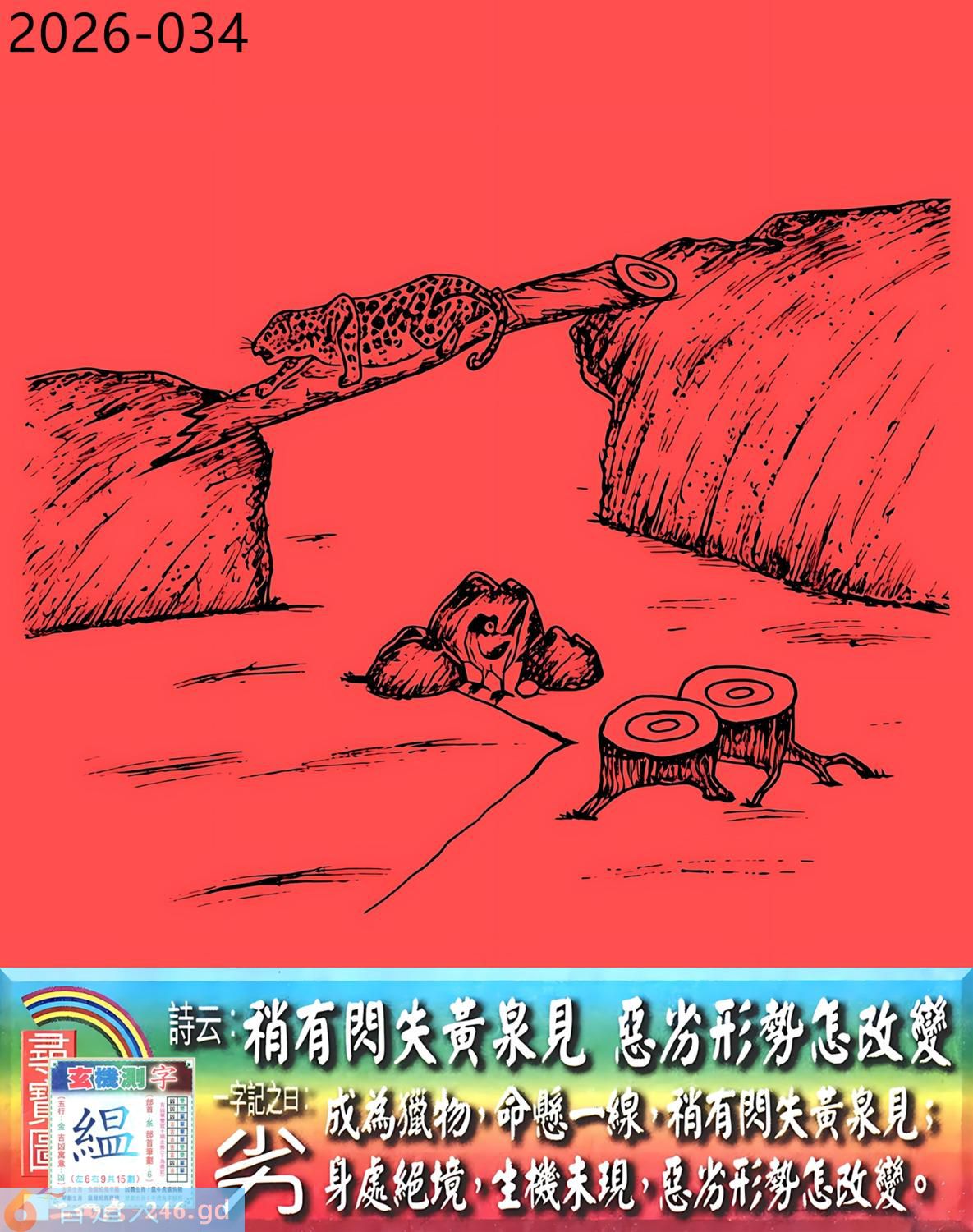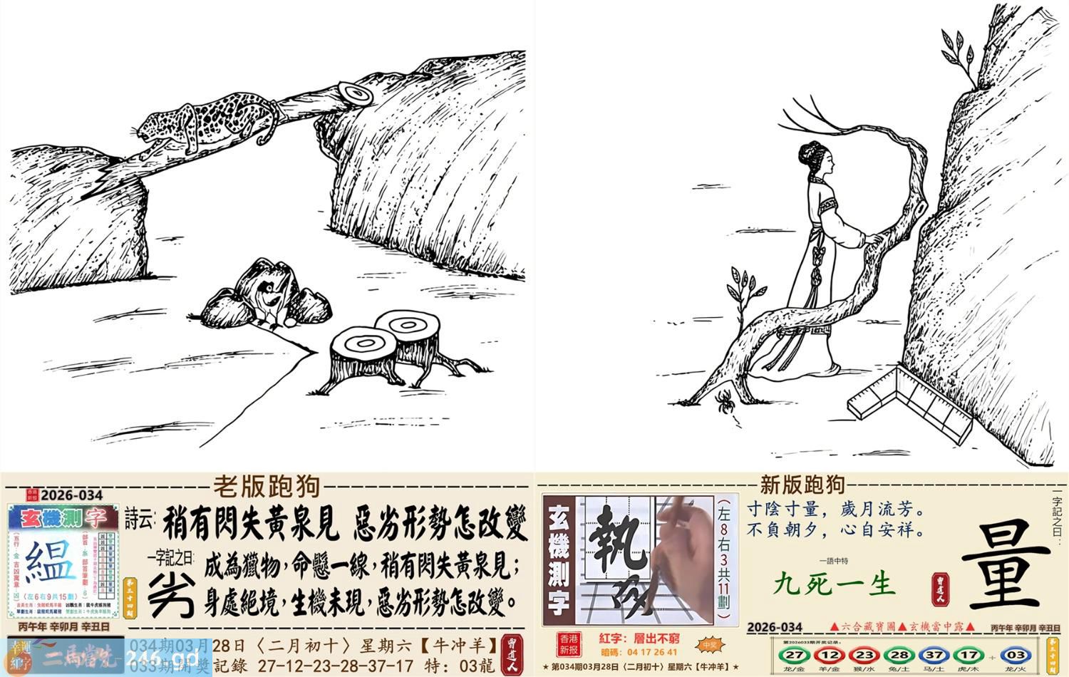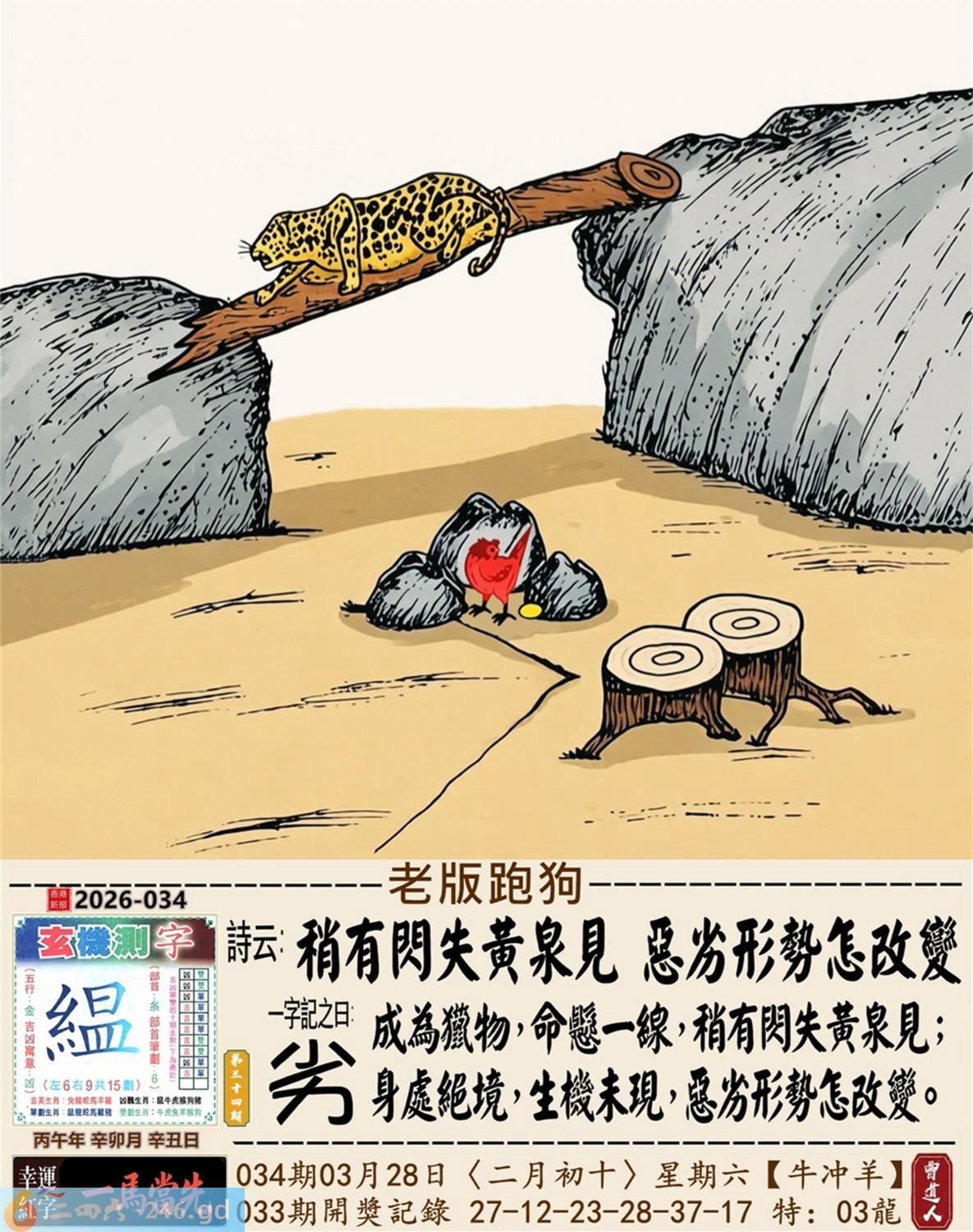 2026年3月28日星期六壁上土牛日冲羊 034期:老版跑狗玄機一字記之曰:【劣】 詩云:稍有閃失黃泉見,惡劣形勢怎改變。 成為獵物,命懸一線,稍有閃失黃泉見; 身處絕境,生機未現,惡劣形勢怎改變。 玄機測字:《緼》 密圖詩:一二好運伴八在 記:三人玩耍最開心 特碼大小單雙句:一山不能容二虎 今期必中:貂蟬 034期:特碼歇后語 敲碎的铜锣-----名(鸣)声不 034期正版四字梅花诗:破旧立新。 034期火车头:烧伤狗。诗:猴死龙伤,无穷二四过一边。 034期香港第一手欲钱料:石头? 034期曾道人说:“龙?” 034期另版四字梅花诗:疯癫和尚。 034期香港第一手欲钱料:欲钱世界选美大赛的结果。 034期曾道人说:“为什么母爱最伟大”? 034期:二字经:红绿。 034期:辣辣是特码 034期智力金壤:胡言乱语 紅字:【層出不窮】 暗码:【04172641】 發財玄機圖:探索周圍儲備充足圖中明鼠藍綠 034期:藏寳圖 新:瘦影自临春水照 老:诗卷长留天地间 禁:鸡禁:0尾玄机字《霜》 2026年034期【生活幽默】版 〖長大了要像爸爸一樣〗 一家人坐在沙發上看電視,突然兒子:"爸爸,我長大了要像你一樣!" 媽媽:"兒子,你想像爸爸什呀?"爸爸聽後得意地笑道:"怎樣,老婆,我還是很優秀的?"轉頭問兒子:"兒子,説説像爸爸什麼?" 兒子:"像你一樣,每天可以和媽媽要十塊錢零花錢!" 爸爸:"......"