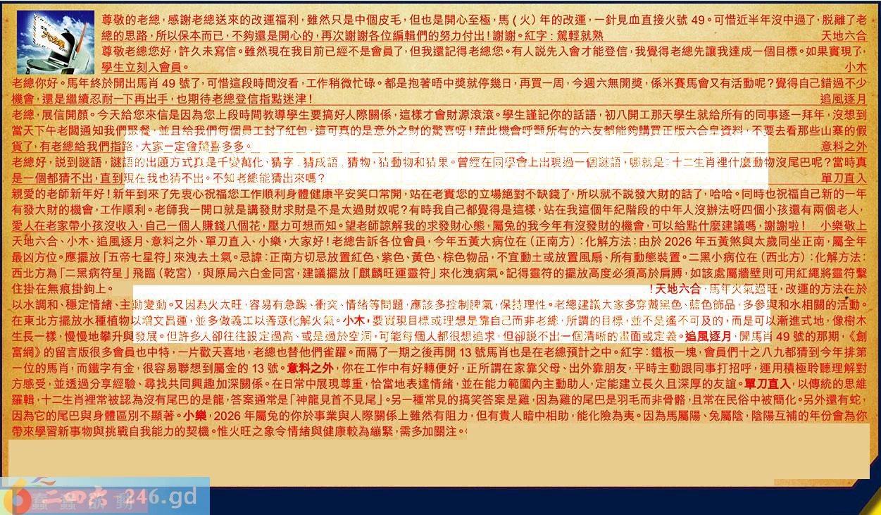 第036期《六合皇信箱文字版》10000%正確!!! 天地六合、小木、追風逐月、意料之外、單刀直入、小樂,大家好!老總告訴各位會員,今年五黃大病位在(正南方):化解方法:由於2026年五黃煞與太歲同坐正南,屬全年最凶方位。應擺放「五帝七星符」來洩去土氣。忌諱:正南方切忌放置紅色、紫色、黃色、棕色物品,不宜動土或放置風扇、所有動熊裝置。二黑小病位在(西北方)化解方法:西北方為「二黑病符星」飛臨(乾宮),與原局六白金同宮,建議擺放「麒麟旺運靈符」來化洩病氣。記得靈符的擺放高度必須高於肩膊,如該處屬牆壁則可用紅繩將靈符繫住掛在無痕掛鉤上。 【1】.尊敬的老總,感謝老總送來的改運福利,雖然只是中個皮毛,但也是開心至極,馬(火)年的改運,一針見血直接火號49。可惜近半年沒中過了,脱離了老總的思路,所以保本而已,不夠還是開心的,再次謝謝各位編輯們的努力付出!謝謝。紅字:駕輕就熟天地六合 〖天地六合〗:馬年火氣過旺,改運的方法在於以水調和、穩定情緒、主動變動。又因為火太旺,容易有急躁、衝突、情緒等問題,應該多控制脾氣,保持理性。老總建議大家多穿戴黑色、藍色飾品,多參與和水相關的活動。在東北方擺放水種植物以增文昌運,並多做義工以善意化解火氣。 【2】.尊敬老總您好,許久未寫信。雖然現在我目前已經不是會員了,但我還記得老總您。有人説先入會才能登信,我覺得老總先讓我達成一個目標。如果實現了,學生立刻入會員。小木 〖小木〗:要實現目標或理想是靠自己而非老總,所謂的目標,並不是遥不可及的,而是可以漸進式地,像樹木生長一樣,慢慢地攀升與發展。但許多人卻往往設定過高、或是過於空洞,可能每個人都很想追求,但卻説不出一個清晰的畫面或定義。 【3】.老總你好。馬年終於開出馬肖49號了,可惜這段時間沒看,工作稍微忙碌。都是抱著晤中獎就停幾日,再買一周,今週六無開獎,係米赛馬會又有活動呢?覺得自己錯過不少機會,還是繼續忍耐一下再出手,也期待老總登信指點迷津!追風逐月 〖追風逐月〗:開馬肖49號的那期,《創富網》的留言版很多會員也中特,一片歡天喜地,老總也替他們雀躍。而隔了一期之後再開13號馬肖也是在老總預計之中。紅字:鐵板一塊,會員們十之八九都猜到今年排第一位的馬肖,而鐵字有金,很容易聯想到屬金的13號。 【4】.老總,展信開顔。今天給您來信是因為您上段時間教導學生要搞好人際關係,這樣才會財源滾滾。學生謹記你的話語,初八開工那天學生就給所有的同事逐一拜年,沒想到當天下午老關通知我們聚餐,並且給我們每個員工封了紅包,這可真的是意外之財的驚喜呀!藉此機會呼籲所有的六友都能夠購買正版六合皇資料,不要去看那些山寨的假货了,有老總給我們指路,大家一定會驚喜多多。意料之外 〖意料之外〗:你在工作中有好轉便好,正所謂在家靠父母、出外靠朋友,平時主動跟同事打招呼,運用積極聆聽理解對方感受,並透過分享經驗、尋找共同興趣加深關係。在日常中展現尊重,怡當地表達情緒,並在能力範圍內主動助人,定能建立長久且深厚的友誼。 【5】.老總好,説到謎語,謎語的出題方式真是干變萬化,猜字.猜成語.猜物,猜動物和猜果。曾經在同學會上出現過一個謎語,哪就是:十二生肖裡什麼動物沒尾巴呢?當時真是一個都猜不出,直到現在我也猜不出。不知老總能猜出來嗎?單刀直入 〖單刀直入〗:以傳統的思維羅輯,十二生肖裡常被認為沒有尾巴的是龍,答案通常是「神龍見首不見尾」。另一種常見的搞笑答案是難,因為難的尾巴是羽毛而非骨骼,且常在民俗中被簡化。另外還有蛇,因為它的尾巴與身體區別不顯著。 【6】.親愛的老師新年好!新年到來了先衷心祝福您工作順利身體健康平安笑口常開,站在老實您的立場絕對不缺錢了,所以就不説發大財的話了,哈哈。同時也祝福自己新的一年有發大財的機會,工作順利。老師我一開口就是講發財求財是不是太過財奴呢?有時我自己都覺得是這樣,站在我這個年紀階段的中年人沒辦法呀四個小孩還有兩個老人,愛人在老家带小孩沒收入,自己一個人賺錢八個花,歴力可想而知。望老師諒解我的求發財心態,屬免的我今年有沒發財的機會,可以給點什麼建議嗎,謝謝啦!小樂敬上 〖小樂〗:2026年屬兔的你於事業與人際開係上雖然有阻力,但有貴人暗中相助,能化險為夷。因為馬屬陽、兔屬陰,陰陽互補的年份會為你帶來學習新事物與挑戰自我能力的契機,惟火旺之象令情緒與健康較為繃緊,需多加關注。 紅字:蠢蠢欲動 暗码:20212528 [释义]比喻敌人准备进攻或坏人阴谋捣乱。 [出处]南朝·宋·刘敬叔《异苑·句容水脉》:“掘得一黑物,无有首尾,形如数百斛舡,长数十丈,蠢蠢而动。”
