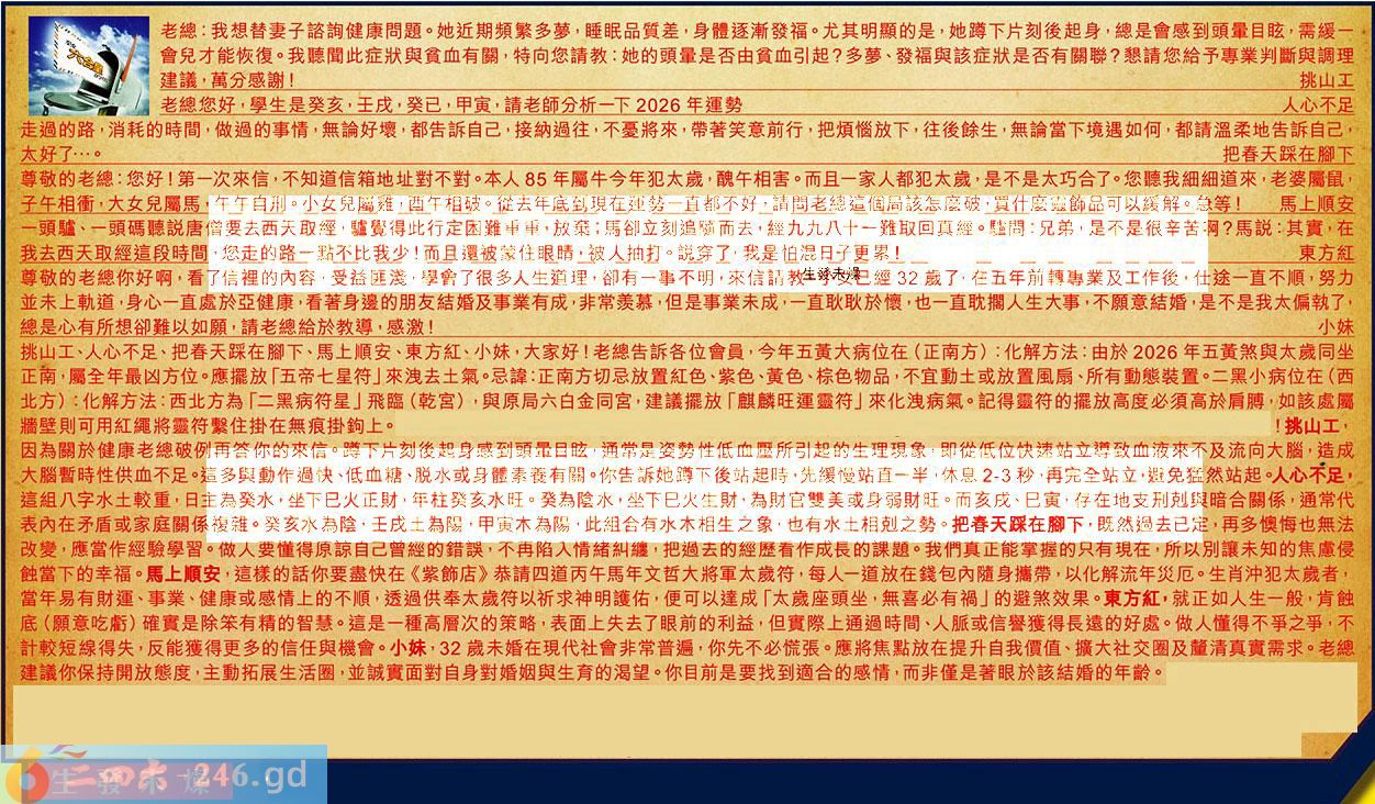 第042期《六合皇信箱文字版》10000%正確!!! 挑山工、人心不足、把春天踩在腳下、馬上順安、東方紅、小妹,大家好!老總告訴各位會員,今年五黃大病位在(正南方):化解方法:由於2026年五黃煞與太歲同坐正南,屬全年最凶方位。應擺放「五帝七星符」來洩去土氣。忌諱:正南方切忌放置紅色、紫色、黃色、棕色物品,不宜動土或放置風扇、所有動態裝置。二黑小病位在(西北方):化解方法:西北方為「二黑病符星」飛臨(乾宮),與原局六白金同宮,建議擺放「麒麟旺運靈符」來化洩病氣。記得靈符的擺放高度必須高於肩膊,如該處屬牆壁則可用紅繩將靈符繫住掛在無痕掛鉤上。 【1】.老總:我想替妻子諮詢健康問題。她近期頻繁多夢,睡眠品質差,身體逐漸發福。尤其明顯的是,她蹲下片刻後起身,總是會感到頭量目眩,需緩一會兒才能恢復。我聽聞此症狀與贫血有關,特向您請教:她的頭量是否由貧血引起?多夢、發福與該症狀是否有關聯?懇請您給予專業判斷與調理建議,萬分感謝!挑山工 〖挑山工〗:因為關於健康老總破例再答你的來信。蹲下片刻後起身感到頭量目眩,通常是姿勢性低血歴所引起的生理現象,即從低位快速站立導致血液來不及流向大腦,造成大腦暫時性供血不足。這多與動作過快、低血糖脱水或身體素養有關。你告訴她蹲下後站起時,先緩慢站直一半,休息2-3秒再完全站立,避免猛然站起。 【2】.老總您好,學生是癸亥,壬戌,癸已,甲寅,請老師分析一下2026年運勢人心不足 〖人心不足〗:這組八字水土較重,日主為癸水,坐下已火正財,年柱癸亥水旺。癸為陰水,坐下已火生財,為財官雙美或身弱財旺。而亥戌、巳寅,存在地支刑克與暗合關係,通常代表內在矛盾或家庭關係複雜。癸亥水為陰,王成土為陽,甲寅木為陽,此組合有水木相生之象,也有水土相剋之勢。 【3】.走過的路,消耗的時間,做過的事情,無論好壞,都告訴自己,接納過往,不憂將來,帶著笑意前行,把煩惱放下,往後餘生,無論當下境遇如何,都請溫柔地告訴自己,太好了....。把春天踩在腳下 〖把春天踩在脚下〗:既然過去已定,再多懊悔也無法改變,應當作經驗學習。做人要懂得原諒自己曾經的錯誤,不再陷入情緒糾纏,把過去的經歷看作成長的課題。我們真正能掌握的只有現在,所以別讓未知的焦慮侵蝕當下的幸福。 【4】.尊敬的老總:您好!第一次來信,不知道信箱地址對不對。本人85年屬牛今年犯太歲,醜午相害。而且一家人都犯太歲,是不是太巧合了。您聽我細細道來,老婆屬鼠,子午相街,大女兒屬馬,午午自刑。小女兒屬雅,酉午相破。從去年底到現在運勢一直都不好,請問老總這個局該怎麼破,買什麼靈飾品可以缓解。急等!馬上順安 〖馬上順安〗:這樣的話你要盡快在《紫飾店》恭請四道丙午馬年文哲大將軍太歲符,每人一道放在錢包內隨身攜帶,以化解流年災厄。生肖沖犯太歲者,當年易有財運、事業、健康或感情上的不順,透過供奉太歲符以祈求神明護佑,便可以達成「太歲座頭坐,無喜必有禍」的避煞效果。 【5】.一頭驢、一頭碼聽説唐僧要去西天取經,驗覺得此行定困難重重,放棄;馬卻立刻追隨而去,經九九八十一難取回真經。瞌問:兄弟,是不是很辛苦啊?馬説:其實,在我去西天取經這段時間,您走的路一點不比我少!而且還被蒙住眼睛,被人抽打。説穿了,我是怕混日子更累!東方紅 〖東方紅〗:就正如人生一般,肯蝕底(願意吃虧)確實是除笨有精的智慧。這是一種高層次的策略,表面上失去了眼前的利益,但實際上通過時間、人脈或信譽獲得長遠的好處。做人懂得不爭之爭,不計較短線得失,反能獲得更多的信任與機會。 【6】.尊敬的老總你好啊,看了信裡的内容,受益匪浅,學會了很多人生道理,卻有一事不明,來信請教子女已經32歳了,在五年前轉專業及工作後,仕途一直不順,努力並未上軌道,身心一直處於亞健康,看著身邊的朋友結婚及事業有成,非常羡慕,但是事業未成,一直耿耿於懷,也一直耽擱人生大事,不願意結婚,是不是我太偏執了總是心有所想卻難以如願,請老總給於教導,感激!小妹 〖小妹〗:32歲未婚在現代社會非常普遍,你先不必慌張。應將焦點放在提升自我價值、擴大社交圈及釐清真實需求。老總建議你保持開放態度,主動拓展生活圈,並誠實面對自身對婚姻與生育的渴望。你目前是要找到適合的感情,而非僅是著眼於該結婚的年齡。 紅字:生發未燥 暗码:05164849 [释义]胎发未干。用以指孩童之时。 [出处]《宋书·索虏传》:“焘大怒,谓奇曰:‘我生头发未燥,便闻河南是我家地。’”