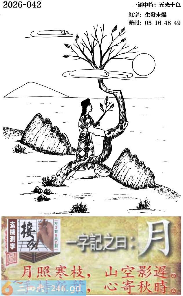 042期跑狗一字記之曰:【月】 月照寒枝,山空影遲。 手持新葉,心寄秋時。 玄機測字:《接》 一語中特:五光十色