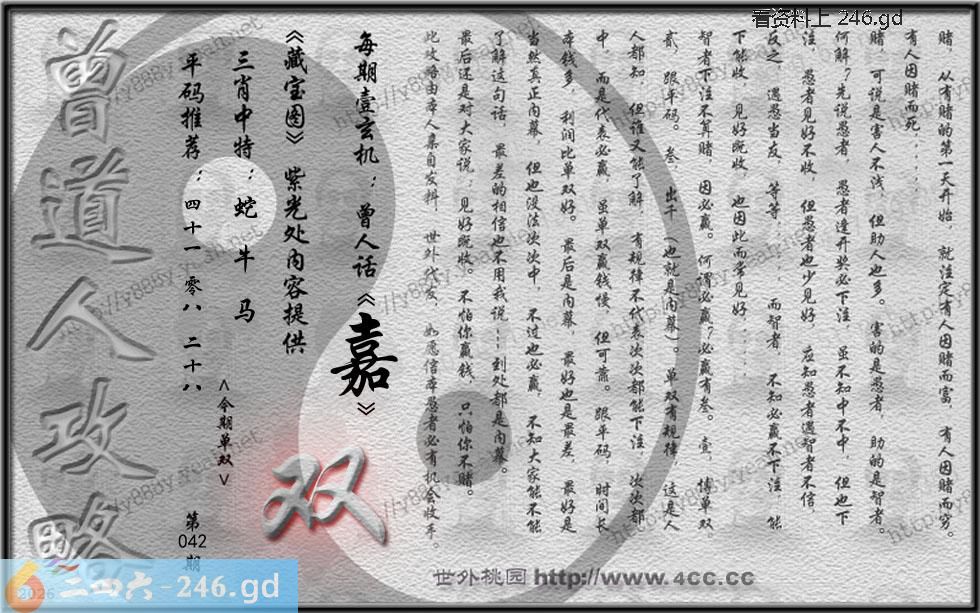 042期藏寶圖 新:曾捧瀛洲札翰来 老:白草黄榆陆拾秋 禁:鸡 禁:0尾 玄機字:《嘉》
