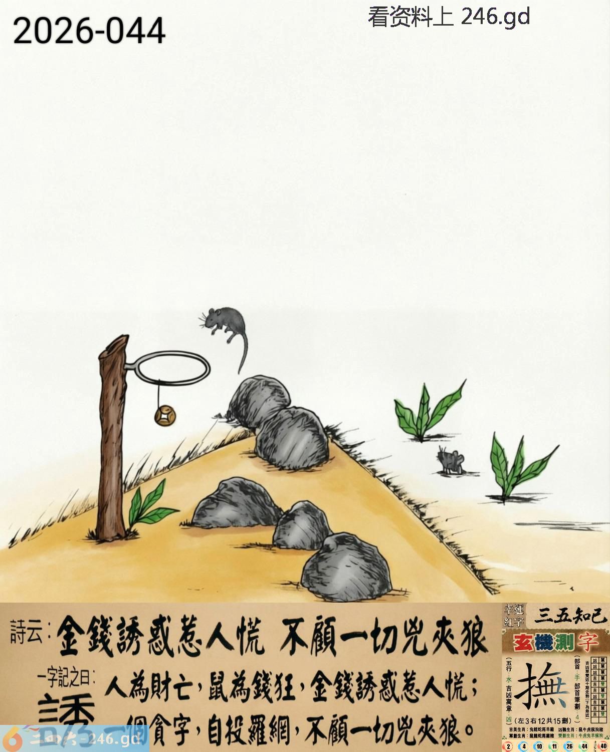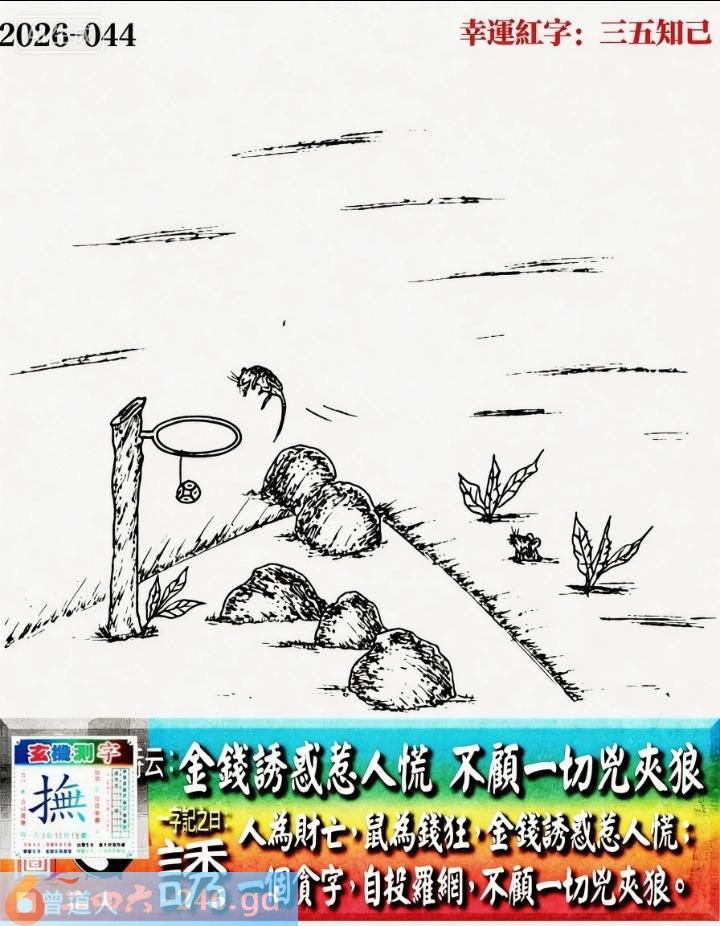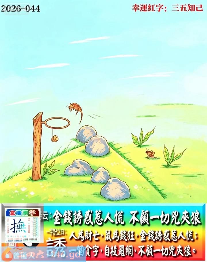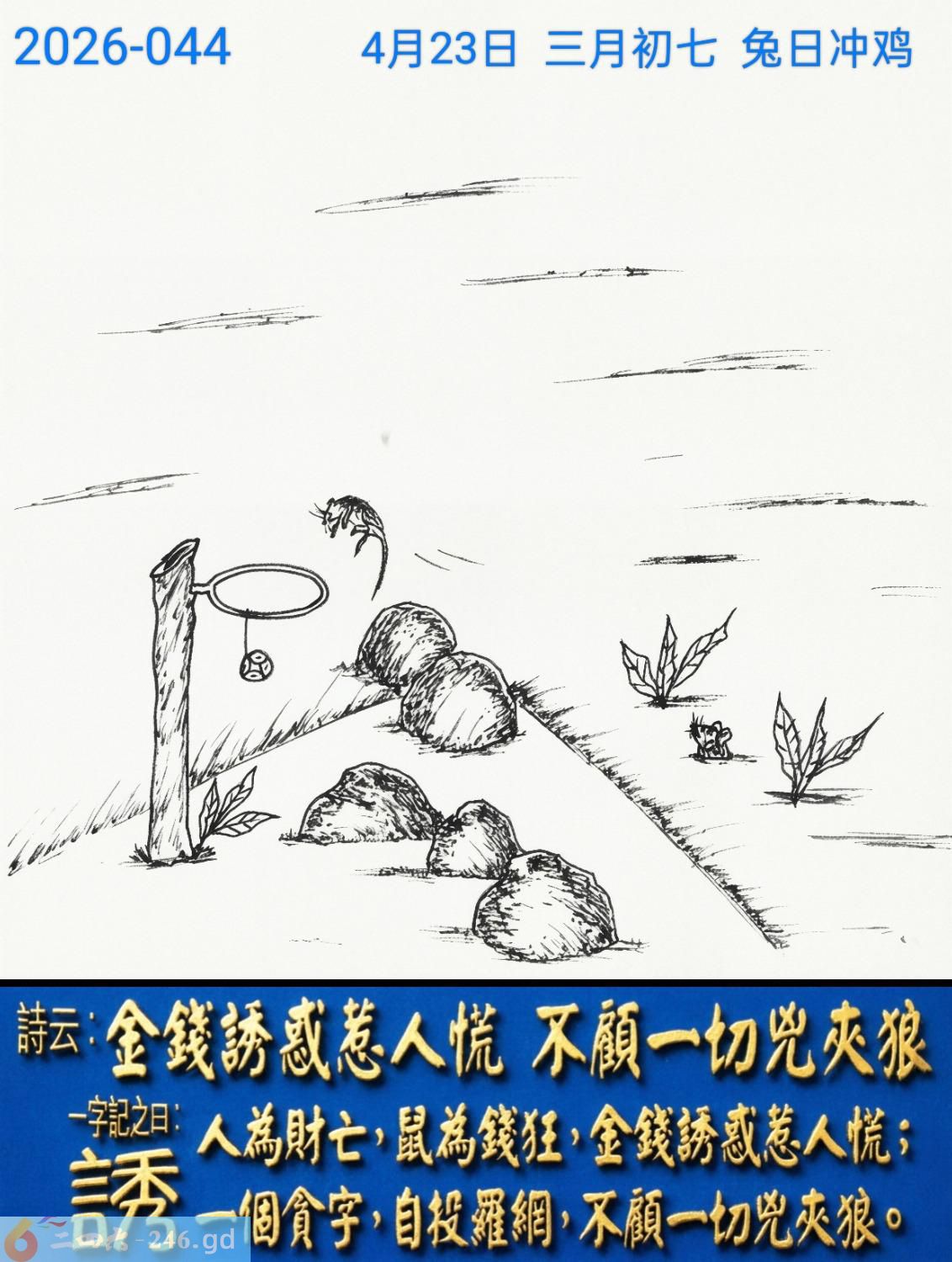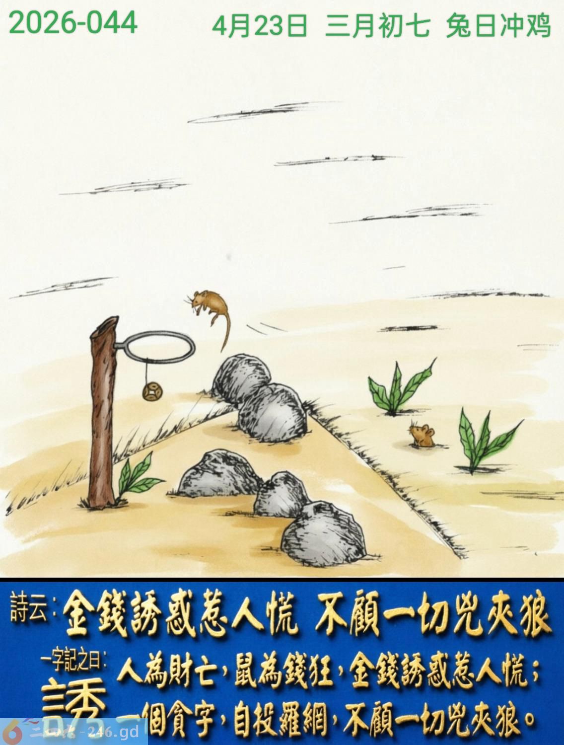 2026年4月23日三月初七星期四炉中火兔日冲鸡 044期:老版跑狗玄機一字記之曰:【誘】 詩云:金錢誘惑惹人慌,不顧一切兇夾狼。 人為財亡,鼠為錢狂,金錢誘惑惹人慌; 一個貪字,自投羅網,不顧一切兇夾狼。 玄機測字:《撫》 密圖詩:英雄難過美人關 記:一個早上跑五圈 特碼大小單雙句:四鄉八里爭先後 今期必中:大喬 044期:特碼歇后語 姑娘拜年-----只有你的席坐,没你的话说 044期正版四字梅花诗:决一胜负。 044期火车头:烧伤狗马。诗:虎死牛伤,一蛇延愿十里长。 044期香港第一手欲钱料:大?。 044期曾道人说:“最大值?” 044期另版四字梅花诗:梅花三弄。 044期香港第一手欲钱料:欲钱看阿里山的高度。 044期曾道人说:“为什么男人到夜总会喜欢送花篮给小姐”? 044期:二字经:蓝绿。 044期:饭店是特码 044期:智力金壤:撕心裂肺 044期信箱紅字:【君子愛財】 044期暗码:【05164849】 044期一語中特:【三七分賬】 玄機發財圖:迅速致命纏繞毒殺圖中明蛇鼠藍綠 044期:藏寶圖 新:杨柳池塘合乱蛙 老:露桃花里不知秋 禁:猴禁:2尾玄机字《垣》 026年044期【生活幽默】版 〖新兵〗 一新兵在十三個星期的基本訓練期中,睡的是硬地,吃的是軍糧,而且經常到野外過夜。 因此訓練一完畢,便即想着回家,好睡幹净的床褥,吃母親做的飯。 到家的那一天,全家人熱烈迎接他。他母親更興高采烈地:"我們已經準備好全家去露營,爲你慶祝!"